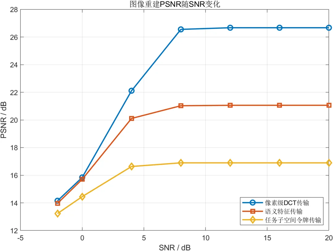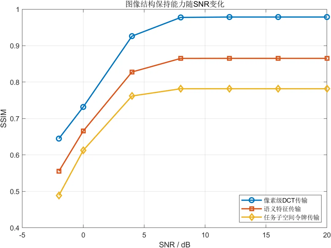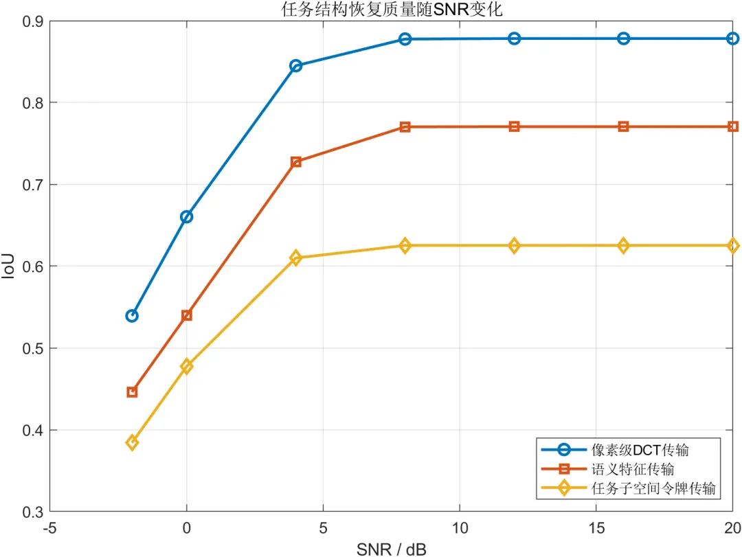 其次,当信噪比进入中等区间后,像素级DCT传输性能快速提升,并逐步在分类准确率、PSNR、SSIM和IoU等指标上取得优势。这表明当信道条件改善到一定程度后,较完整的图像细节能够为接收端提供更多判别信息和更优的结构支撑,因此像素级链路在综合性能上开始反超。也就是说,任务驱动传输并不意味着像素级方案必然落后,而是说明不同链路在不同资源条件下具有不同适用区间。若系统工作在极端受限条件下,紧凑语义表示更有价值;若系统具备一定信道质量和资源空间,则更完整的图像表示可能带来更高上限。