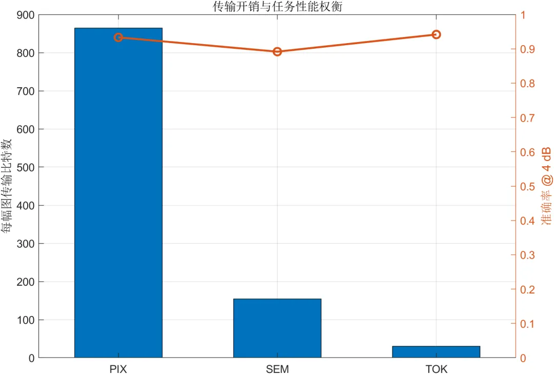 在4 dB这一具有代表性的中低信噪比点上,系统结果表现出较清晰的权衡关系。像素级DCT传输的分类准确率最高,但单位图像传输比特数也显著大于另外两类方案;语义特征传输的开销明显下降,但准确率略有损失;任务子空间令牌传输进一步降低了开销,同时保持了较接近的任务性能。由此可以看出,若以绝对分类性能为优先目标,像素级传输更有利;若系统更强调带宽节约与低复杂度,令牌型方案则具有实际价值。这一结果与近期研究中关于自适应带宽、任务相关表示和轻量化语义编码的发展趋势是相一致的。