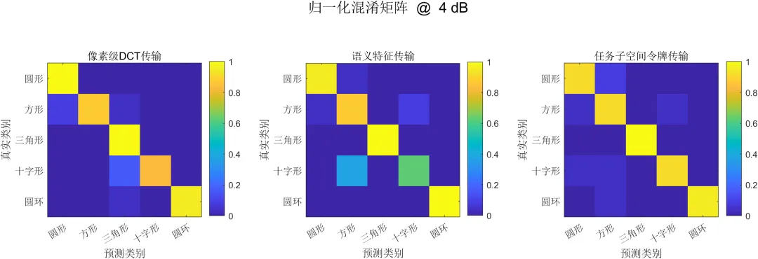 除了上述曲线指标之外,本文还绘制了典型样本重建图和归一化混淆矩阵。前者用于直观展示不同方案在同一信噪比下的恢复特征与失真模式,后者则用于分析类别间易混淆关系。特别是混淆矩阵能够揭示某些结构相近类别在不同链路中的误判规律,这对于进一步改进语义特征设计具有直接指导意义。
