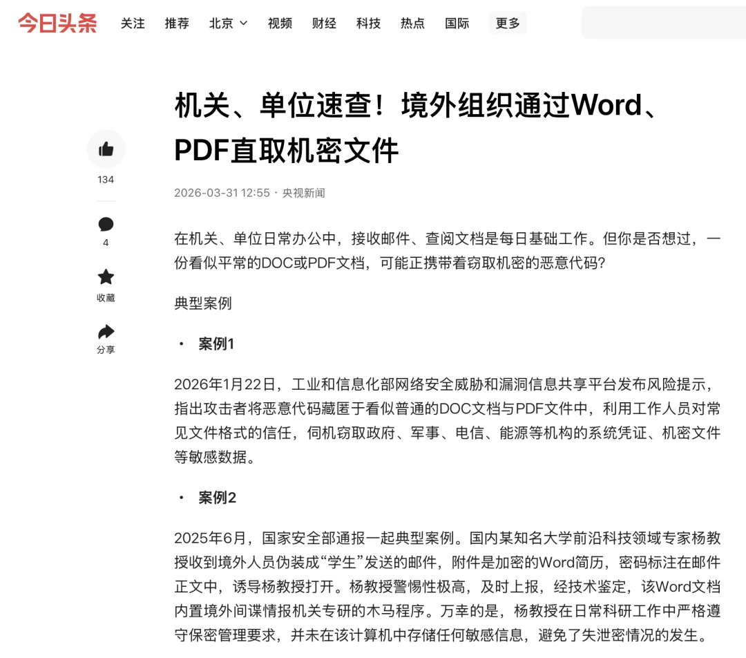 近期,央视新闻及国家安全部联合披露,境外间谍情报组织利用带有恶意宏的Word文档、伪装成正常文件的PDF病毒,对我国政企单位、科研机构发起定向窃密攻击,多起案例被官方通报,引发各单位全员安全排查、紧急补防。