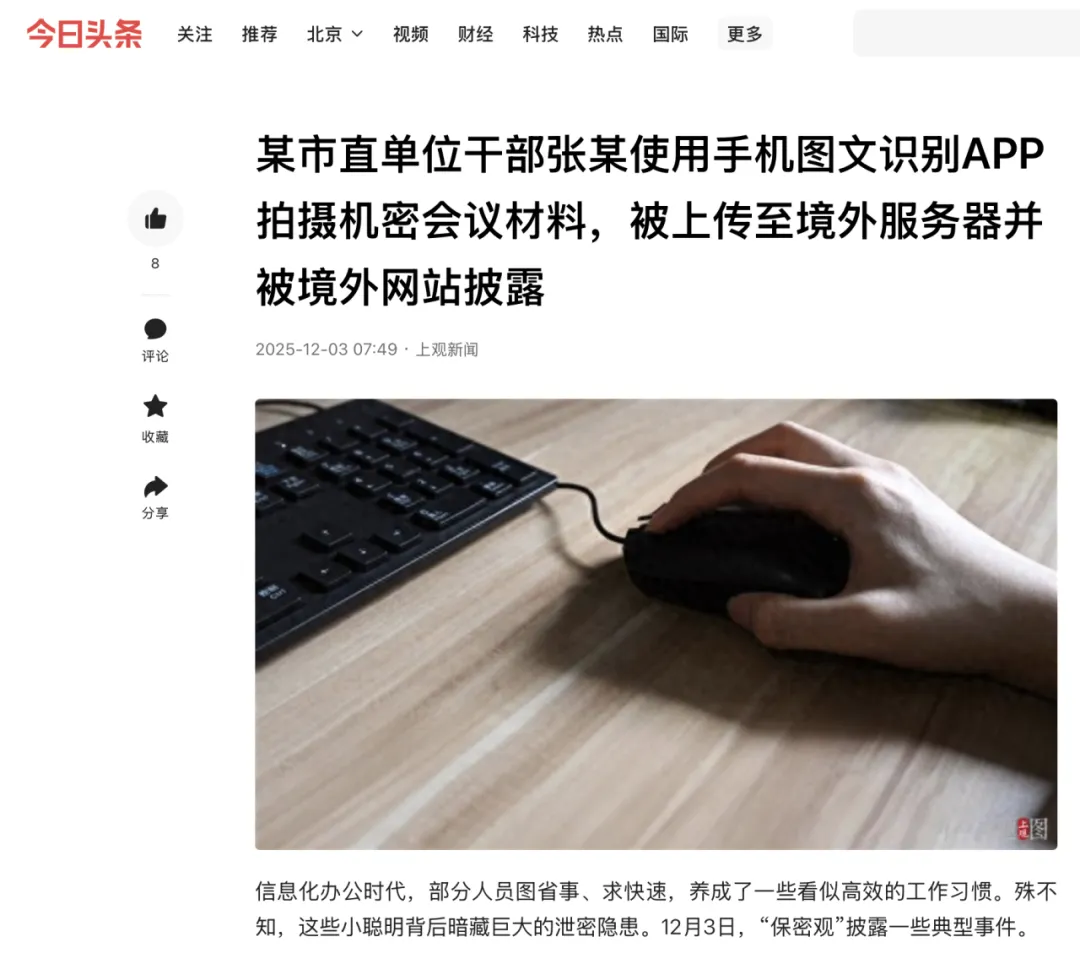 殊不知,在点击“识别”“转换”的瞬间,这些涉密图片会自动上传至工具开发者的境外服务器,相当于主动将工作秘密、国家机密“拱手相送”,成为目前最隐蔽的泄密渠道之一。