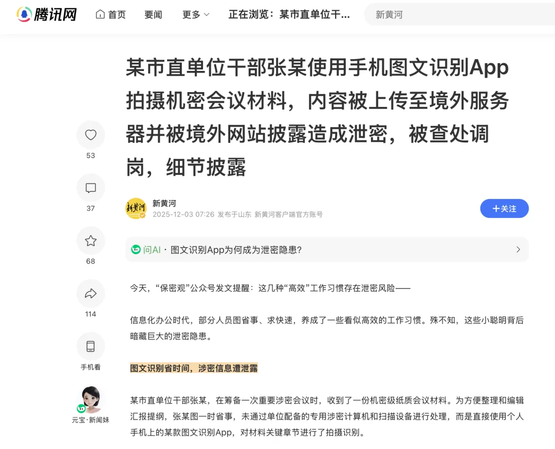 为了提高办公效率,不少员工处理涉密会议材料、内部通讯录、项目图纸时,会使用各类在线OCR识别工具、免费扫描类APP,将图片转为可编辑文字。