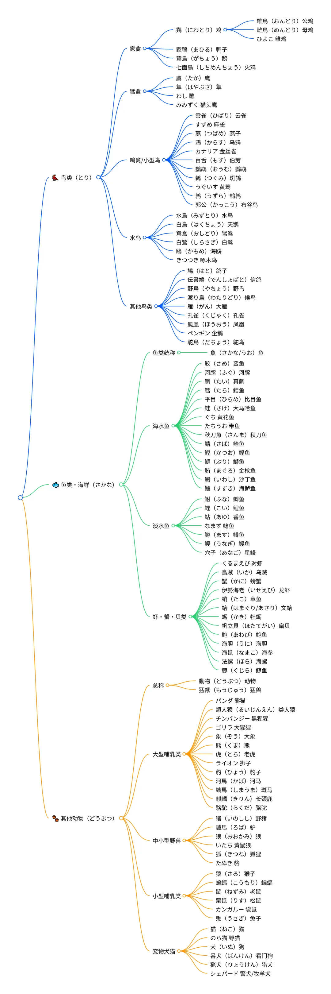 鳥(とり)、魚(さかな)、犬(いぬ)、猫(ねこ)、熊(くま)、虎(とら)。 - 拓展提示