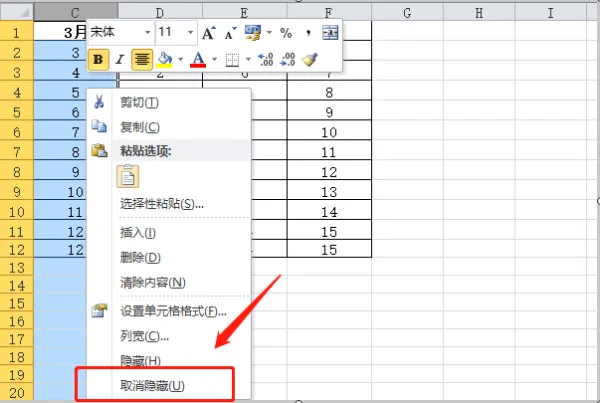 2、首先选中C列的数据,然后按住鼠标左键往左拉,直到选中序号那一列则松开鼠标,然后点击鼠标右键,在弹出框里选择“取消隐藏”;