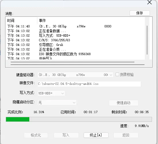 在软碟通中导入Ubuntu的ISO,并在U盘中写入
