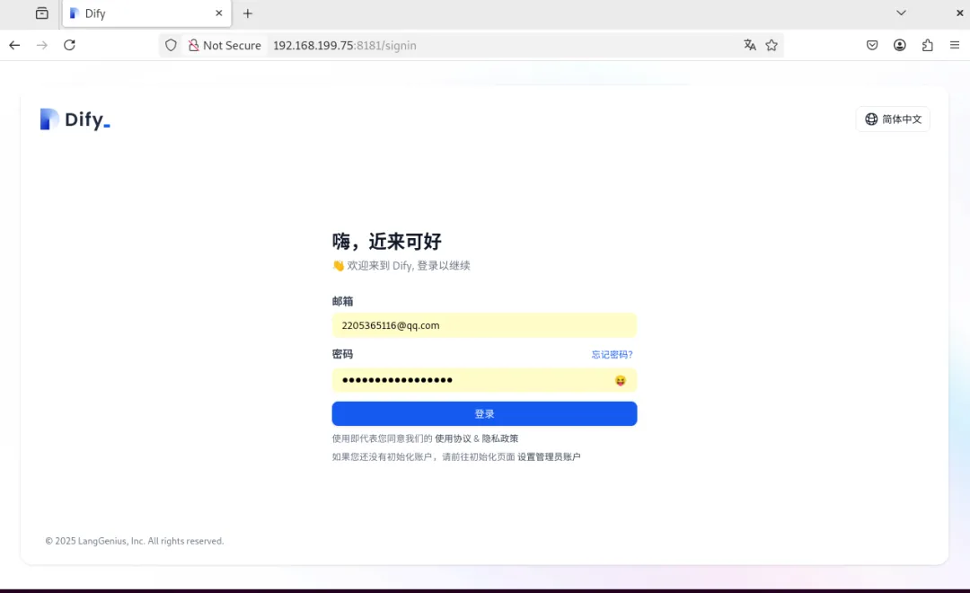 最后在浏览器里面输入:http://服务器ip:8181即可进入dify