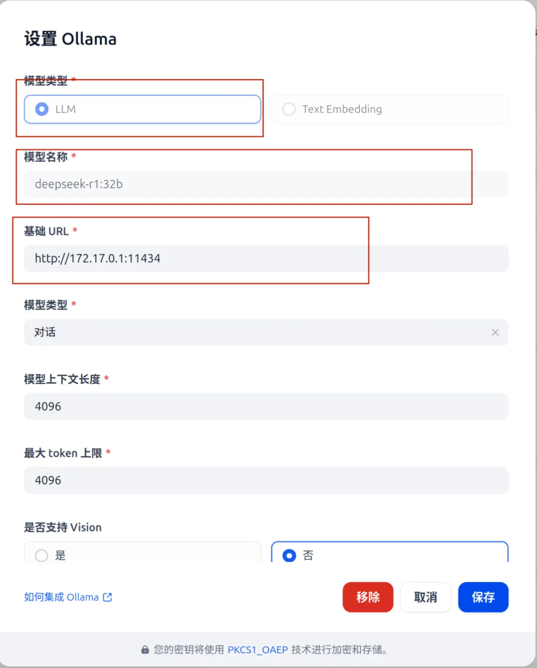 (2)在ollama插件中配置本地部署的模型(暂时提供一种大模型 deepseek-r1:32b。并同时配置embedding模型)