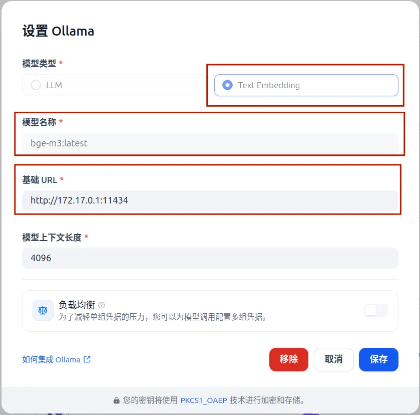配置embedding模型的操作如下(注意模型名称和基础URL要严格保持一致)