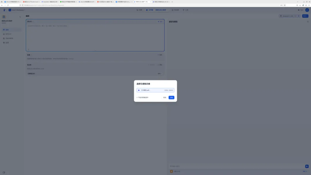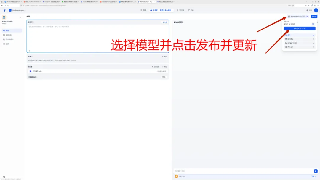 (5)返回知识助手工作流页面,关联创建的知识库并选择模型,点击发布即可关联知识库