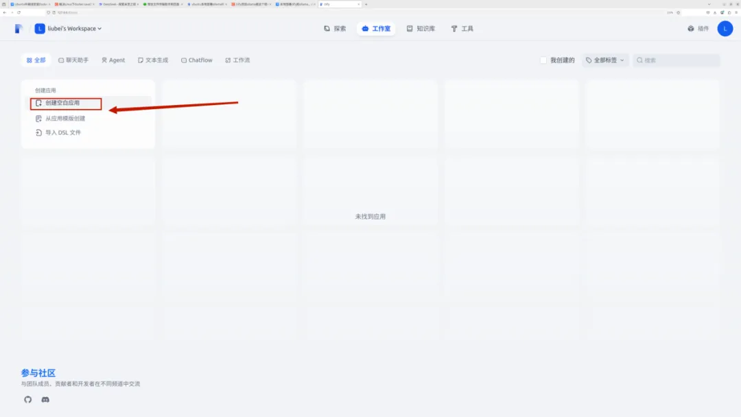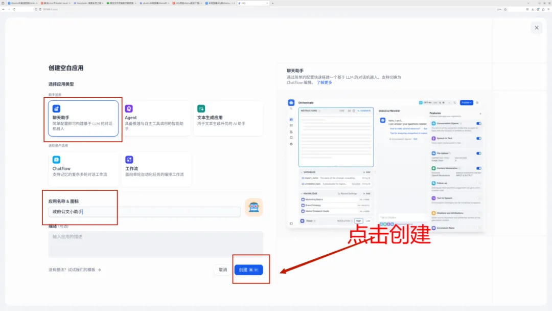 (3)点击首页,创建空白应用(以知识助手举例),输入应用名称,并点击创建