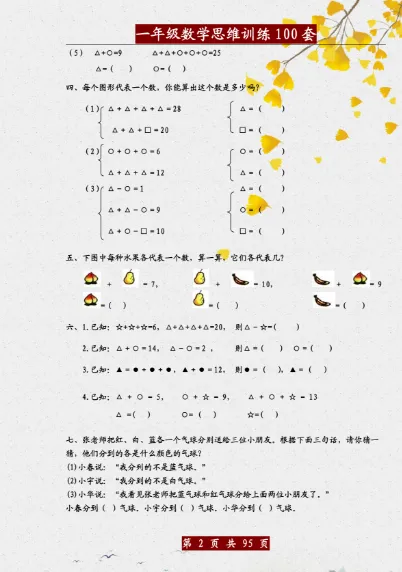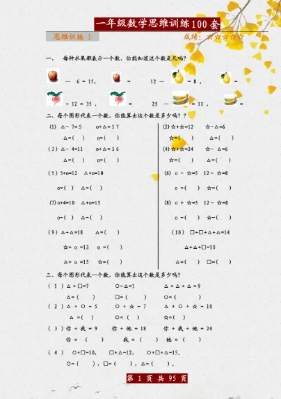一年级下数学思维训练题100套,PDF电子版,可打印,免费下载