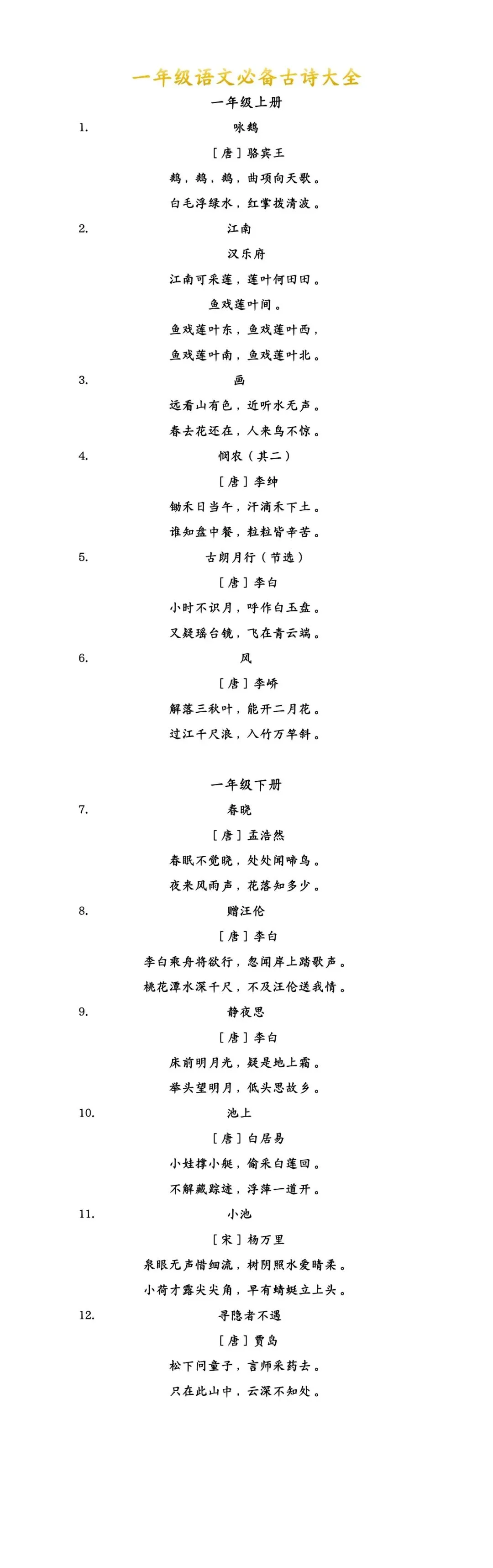 今天为大家整理了部编版一年级上下册全部必背古诗,篇目齐全、排版清晰,无多余干扰,家长保存即可直接打印,每天带孩子读一读、背一背,积累语感,考试不丢分!