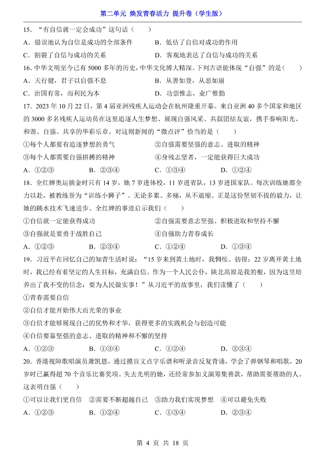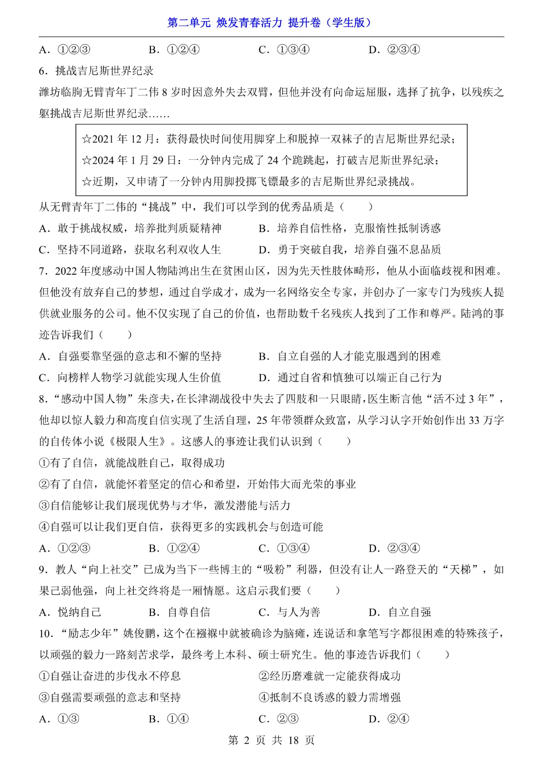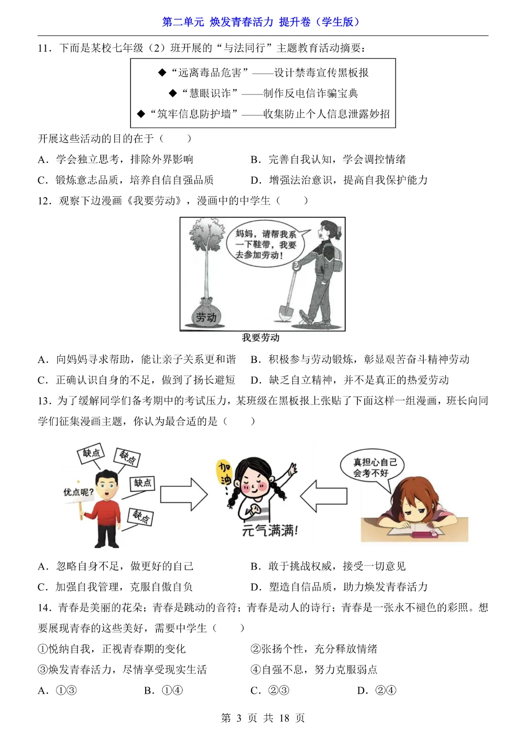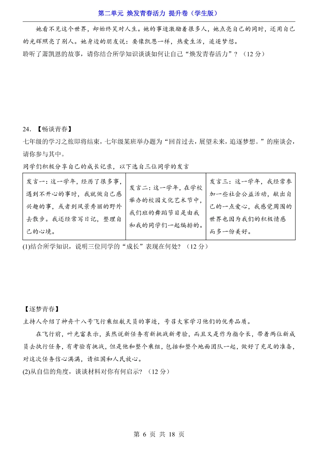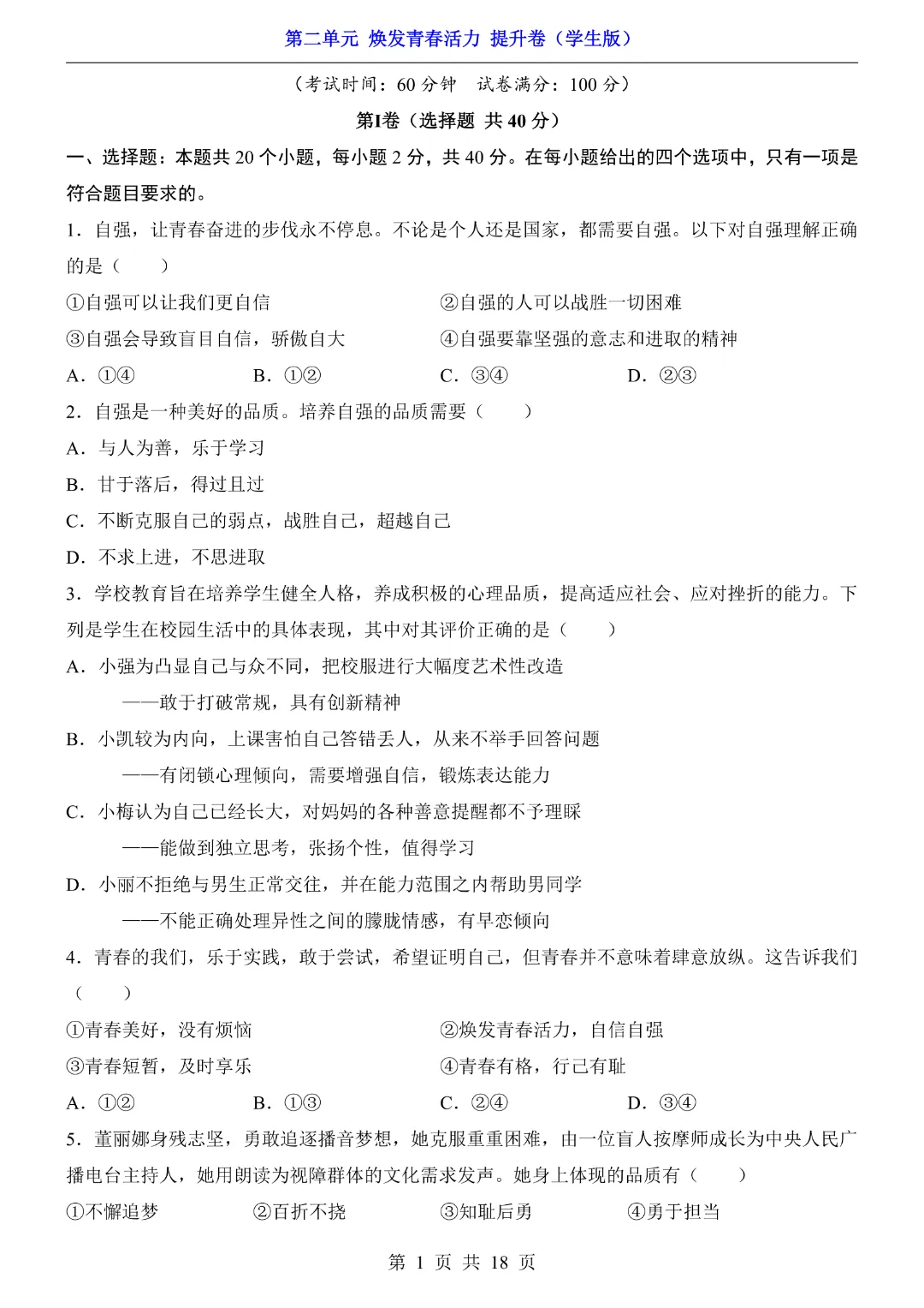 今天给大家分享的是:【七年级下册道法】【人教版】第2单元 焕发青春活力提升卷带答案|完整高清电子版可打印