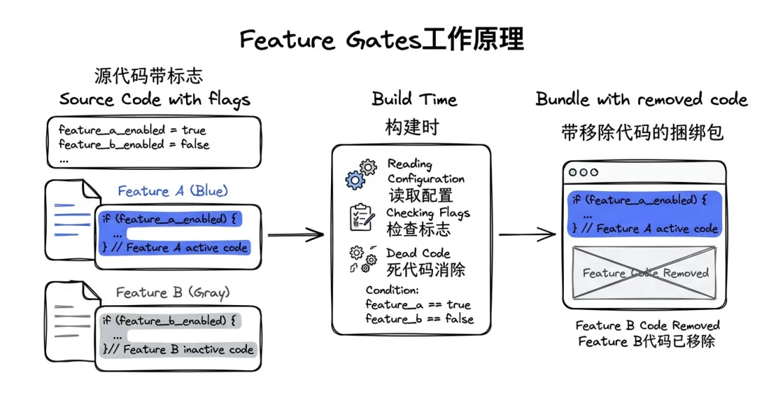 // 源码if (feature(‘BUDDY_SYSTEM’)) { await initializeBuddy()}// 编译后(如果BUDDY_SYSTEM未启用)// 这段代码会被完全删除