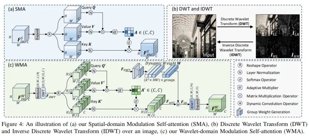 每个 SWGroup 内部,交替使用了两种核心的 Transformer 变体:SMA(空间域调制自注意力) 和 WMA(小波域调制自注意力)。