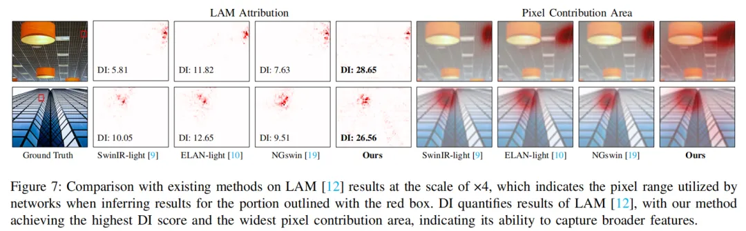在轻量级 SR 赛道中,DMNet 的“小波提特征 + 傅里叶算损失”策略提供了一个优秀的范本。通过其论文中提供的局部归因图(LAM)可以看出,DMNet 激活的像素范围(红点分布)显著广于常规的轻量级网络,证明其有效感受野得到了极大扩展。