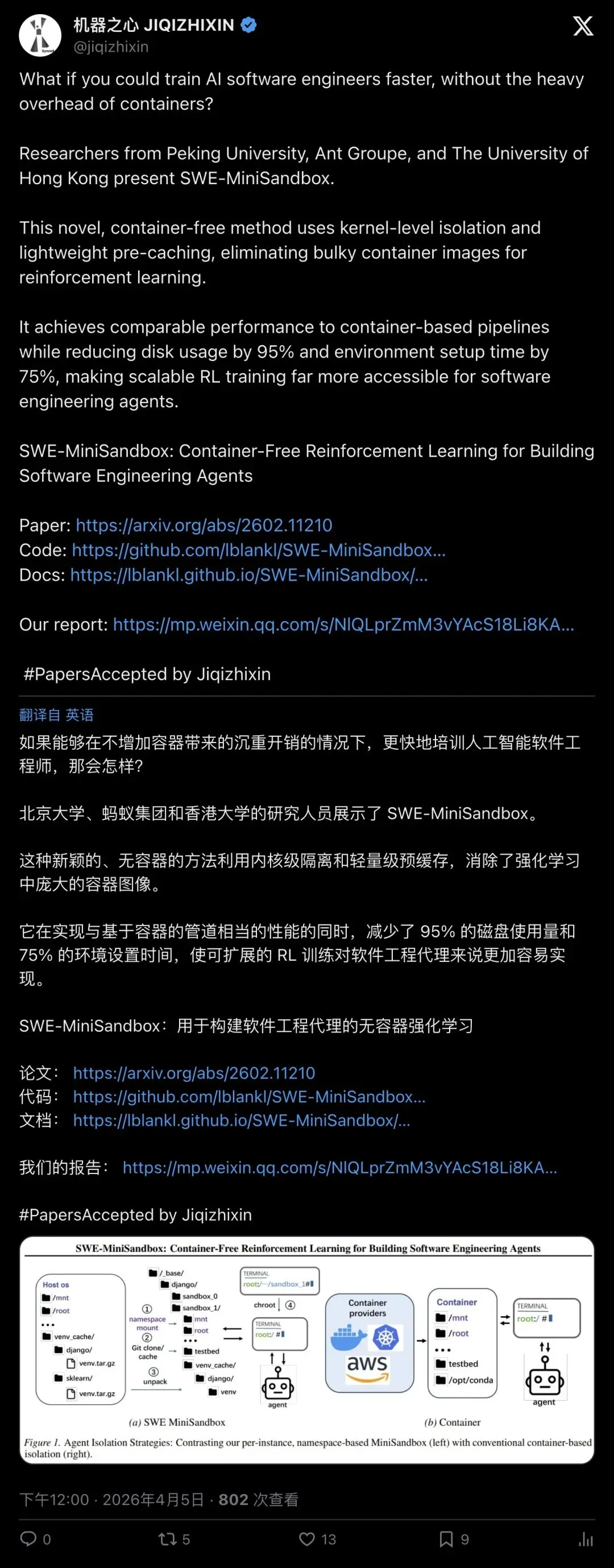 「无容器」训练AI软件工程师爆了!SWE‑MiniSandbox用namespaces+chroot狂砍95%磁盘,环境准备快75%?