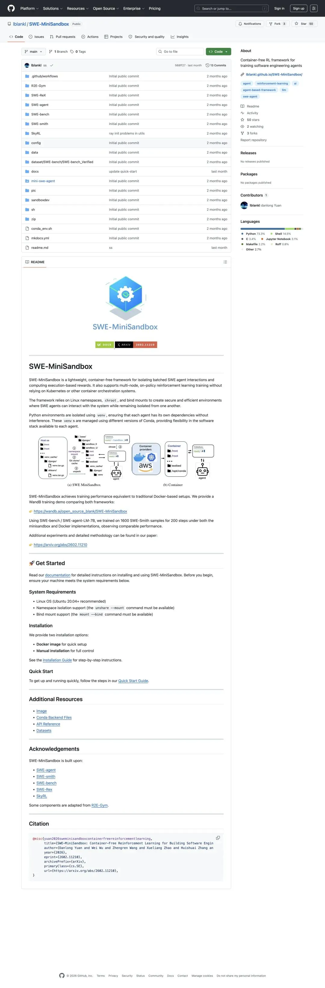 SWE‑MiniSandbox 自己在 README 里把底层方案写得很清楚: