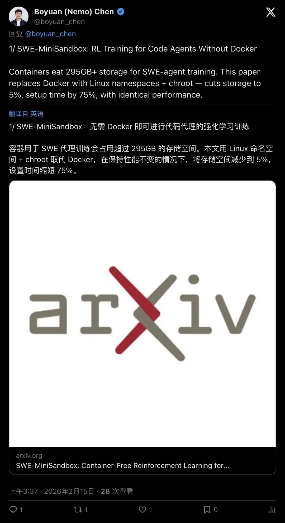 ▲ 一位研究者在 X 上把这事总结成一句话:用Linux namespaces + chroot替换 Docker,存储降到 5%,setup time 降 75%。