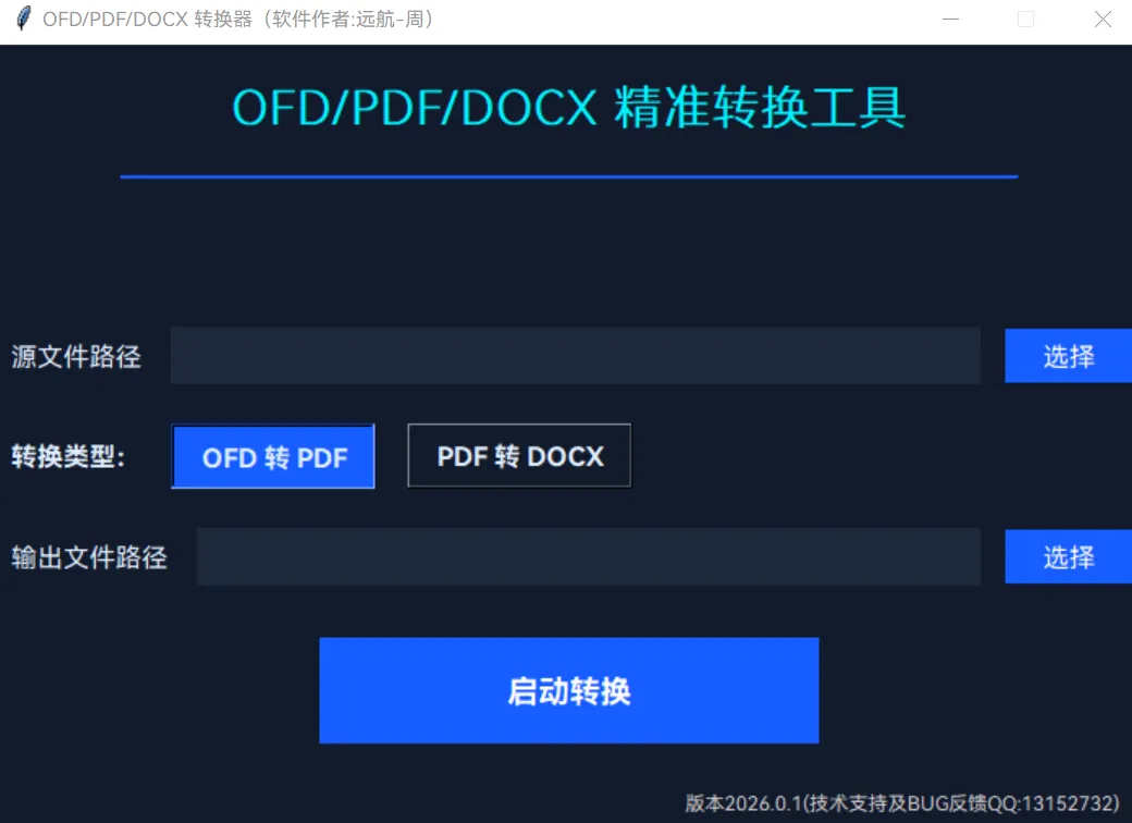 「OFD/PDF ,PDF/DOCX精准转换工具」是由【远航-周】利用AI研发的一款文档格式转换软件。软件已打包为独立的 EXE 可执行文件,双击即可运行,无需安装环境或任何依赖库,真正做到“零安装、即开即用”。