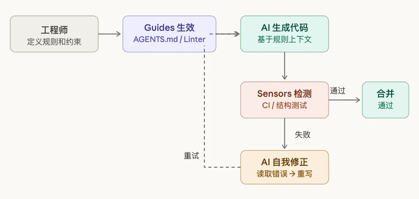 只有 Guides 没有 Sensors:AI 编码了规则,但永远不知道规则有没有被遵守。 只有 Sensors 没有 Guides:AI 一直在犯同样的错误,然后修,然后再犯。