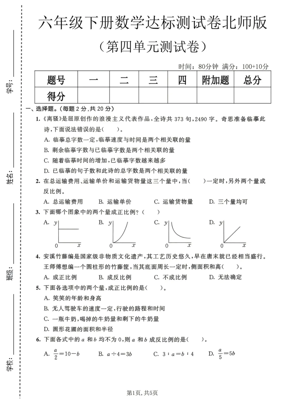 【免费下载】六年级(下)数学 第四单元达标测试卷《北师版》,PDF电子版,共5页,先保存,以免资源失效