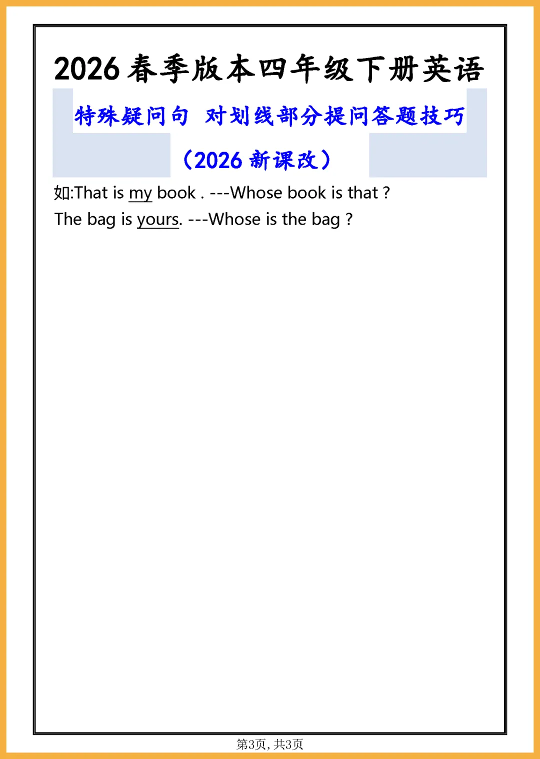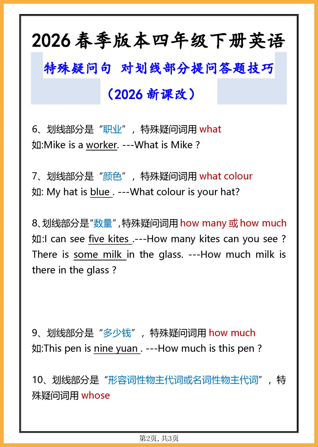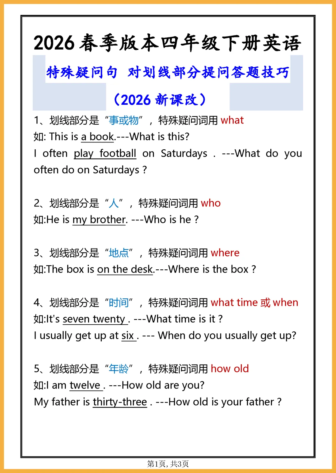 各位家长注意啦!2026 春新版四年级下册英语《特殊疑问句答题技巧》新鲜出炉,整整 3 页精华内容。这份资料专门梳理了 what、where、when 等常见疑问词的用法,通过清晰口诀和典型例题,帮孩子快速掌握答题规律,轻松避开考试陷阱,从此不再混淆句型。想要孩子英语成绩稳步提升?赶紧打印出来,让孩子每天练一练,扎实基础,自信应对新学期挑战!