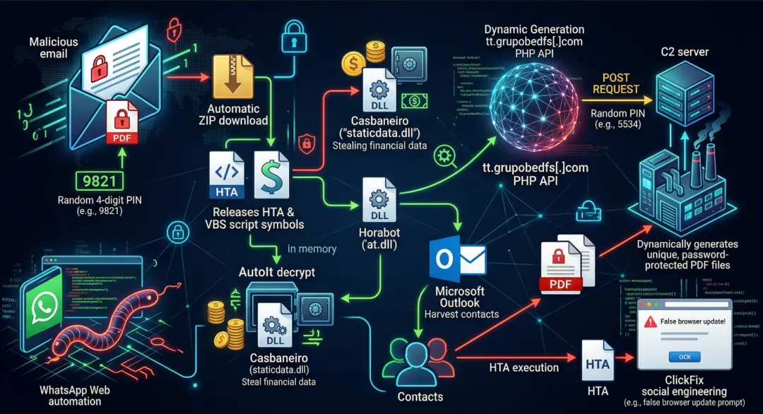 纵观整个攻击链路,我们能看到 Water Saci 组织展现出了极强的架构解耦与动态演进能力。他们维持着一个多管齐下的庞大攻击基础设施:一边用 ClickFix 和 WhatsApp 自动化主攻普通消费者;另一边利用 Horabot 的邮件劫持和动态 PDF 生成引擎,疯狂撕裂企业内网的边界。