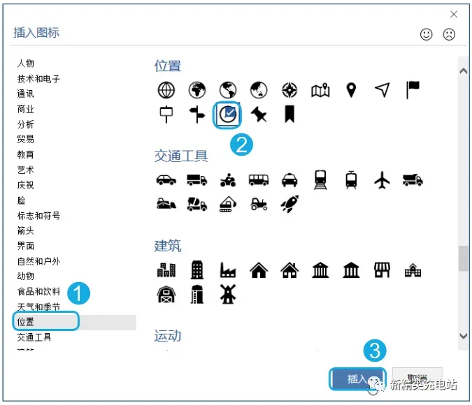 Step 02 选择需要的图标。打开【插入图标】对话框,在左侧选择图标类型,如选择【位置】选项;在右侧【位置】栏中选中需要的图片;单击【插入】按钮,如下图所示。