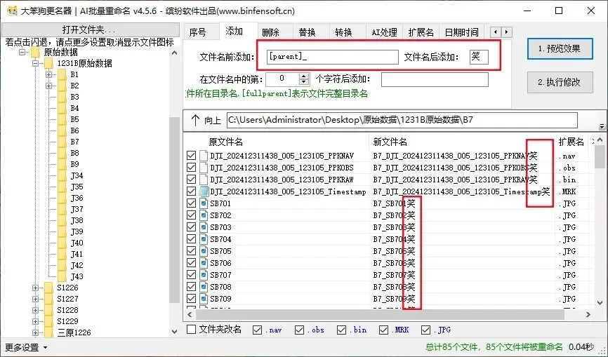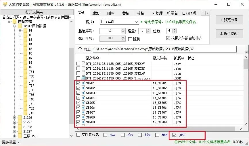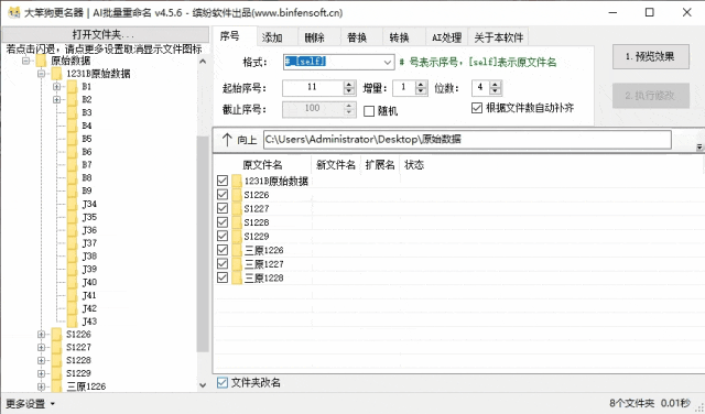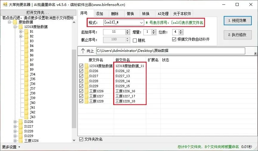 重命名文件:按原格式#_[self],这里“#”代表下边的序号,而“[self]”表示原始文件名称。起始序号选的“11”即代表“#”的初始数值。勾选“根据文件自动补齐”是为了保证数据冗杂的情况下,不出现遗漏。输入完想要的条件之后,点击“1预览效果”,可以查看有没有遗漏错误,确认无误后点击“2执行修改”即可完成重命名操作。