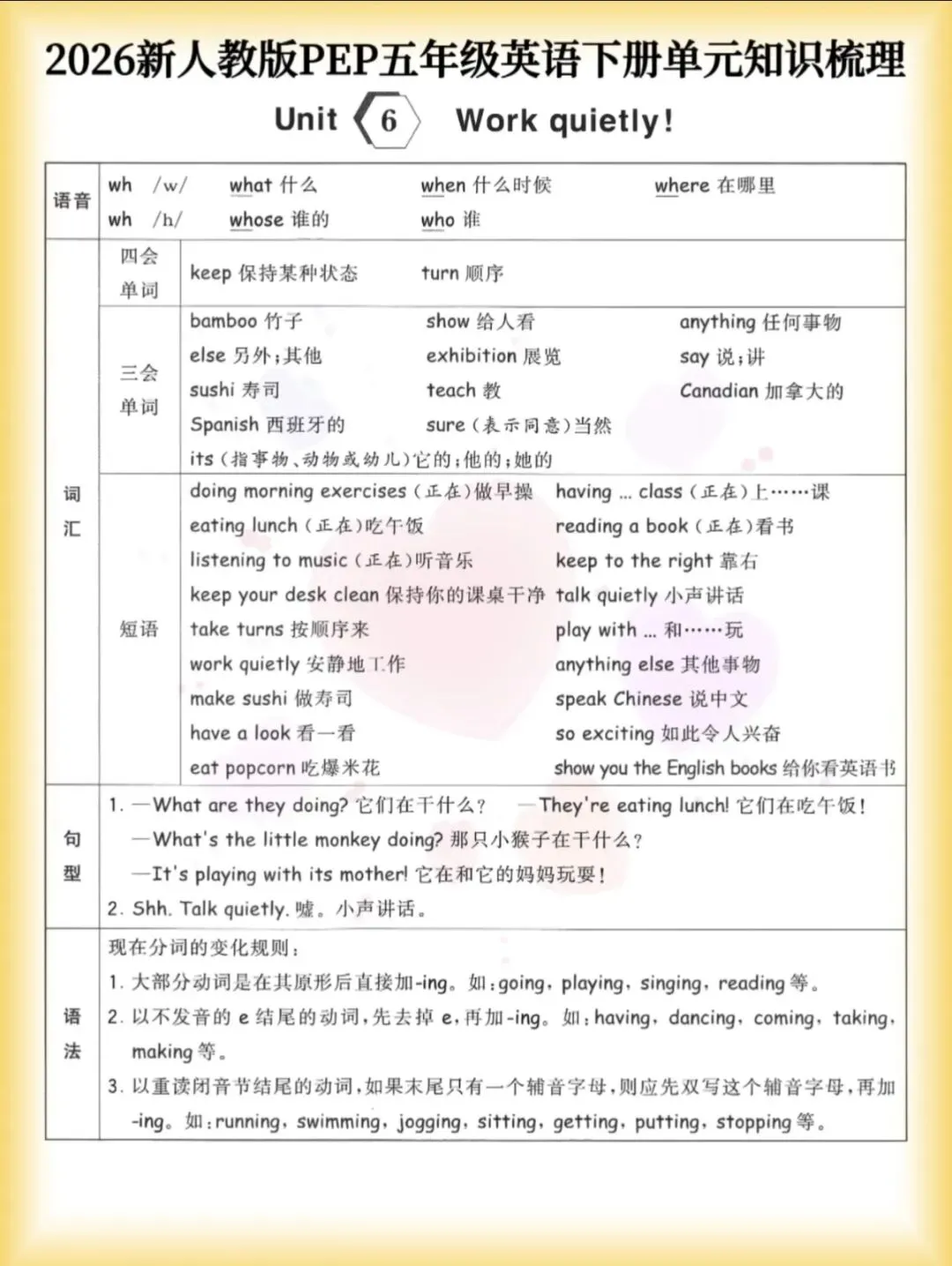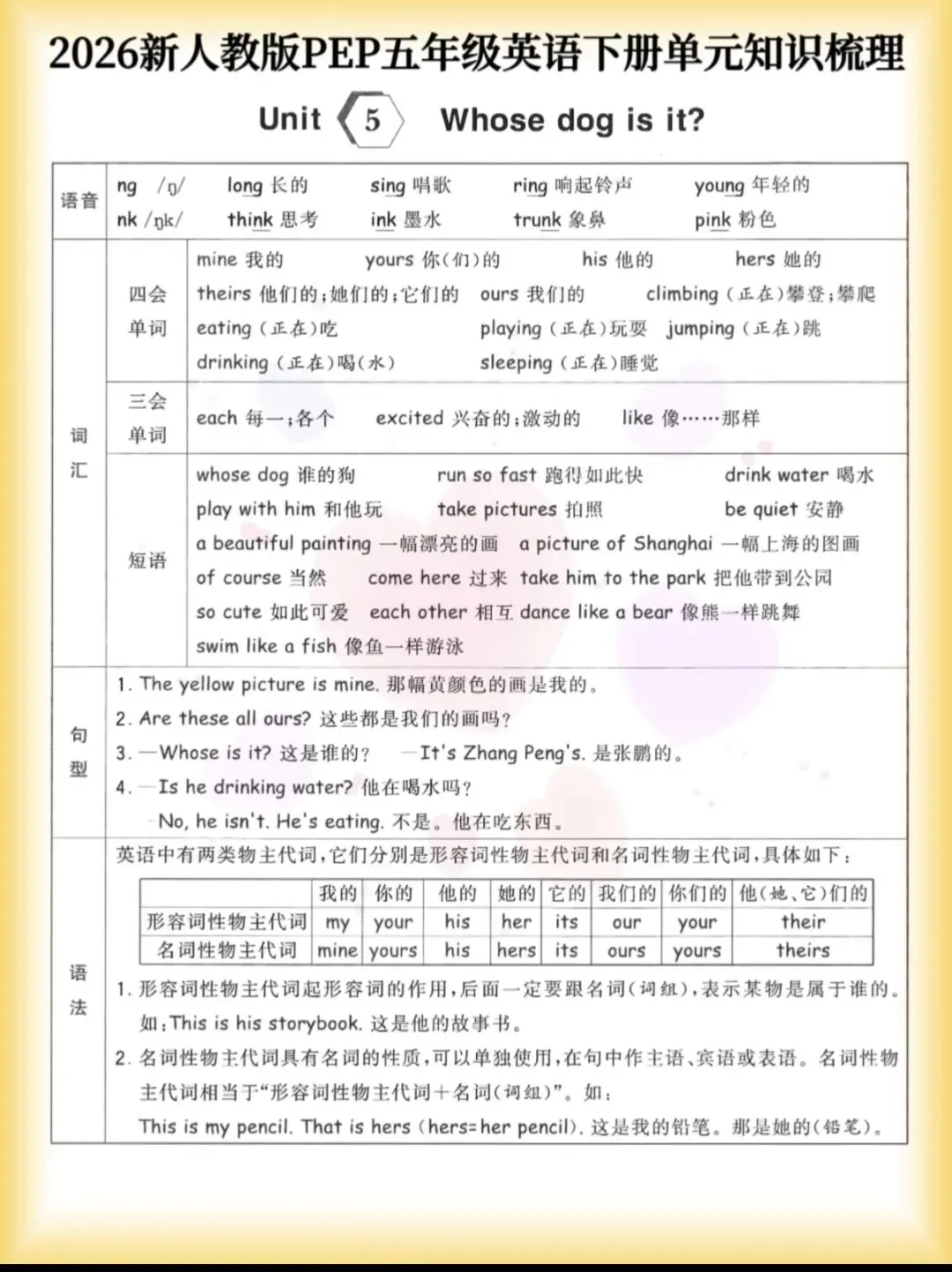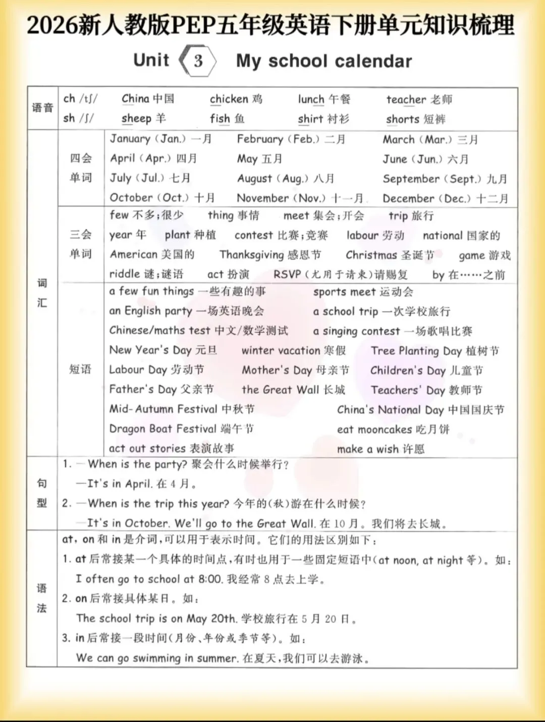 五年级下册英语知识点多又散?别担心!今天帮大家做一次全面系统的知识梳理,把单词、句型、语法、交际用语全部整理到位,让复习更清晰、更高效。