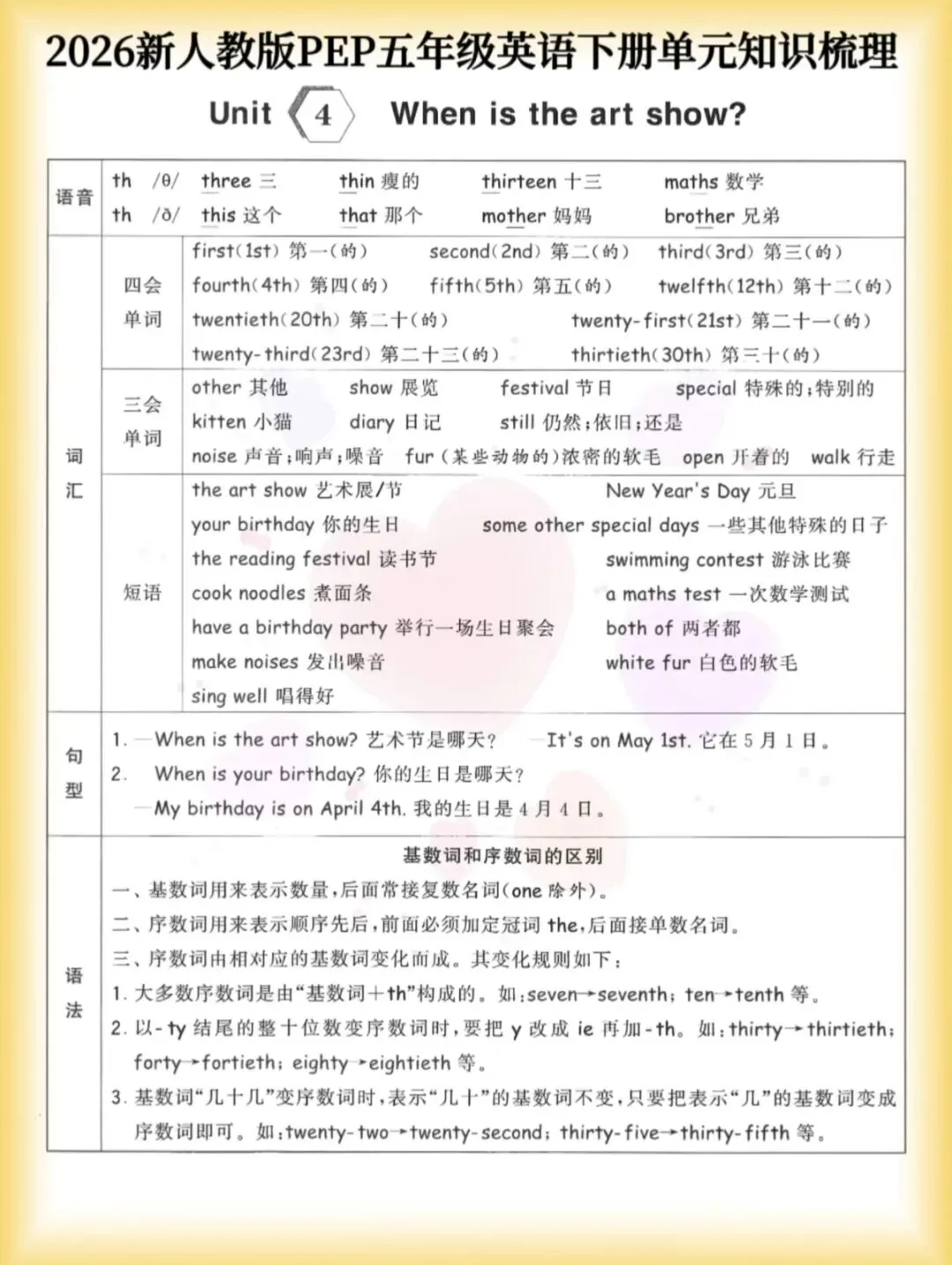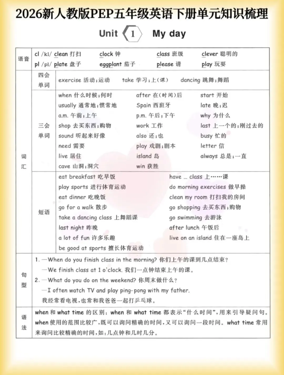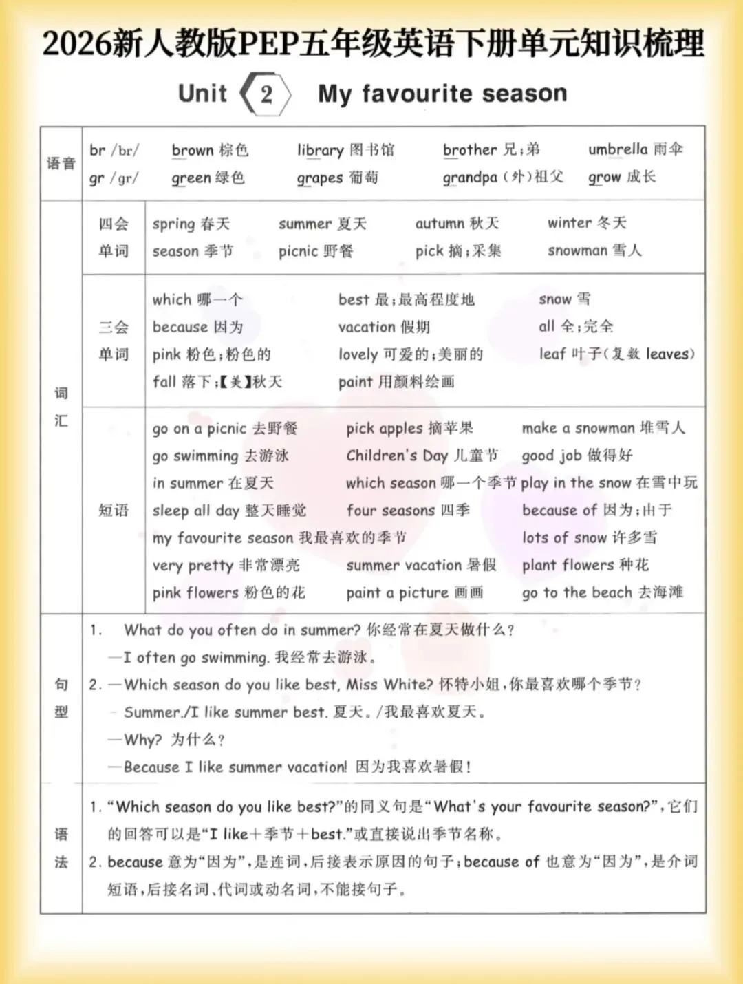 五年级下册英语知识点多又散?别担心!今天帮大家做一次全面系统的知识梳理,把单词、句型、语法、交际用语全部整理到位,让复习更清晰、更高效。