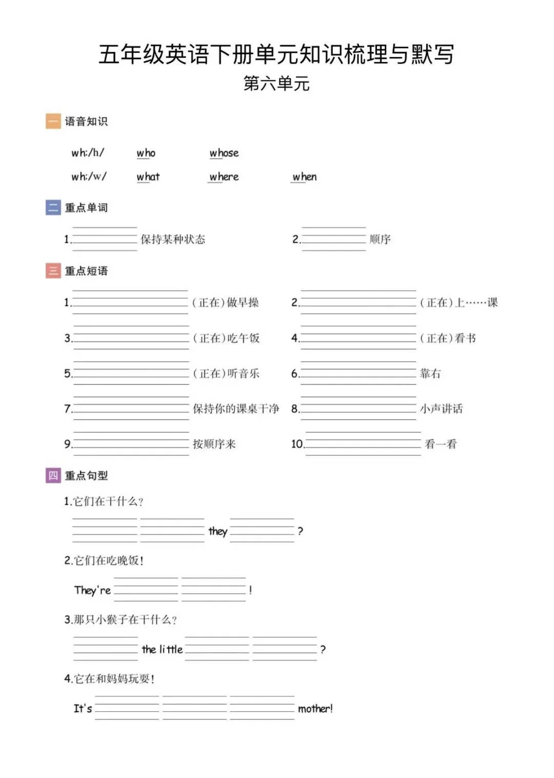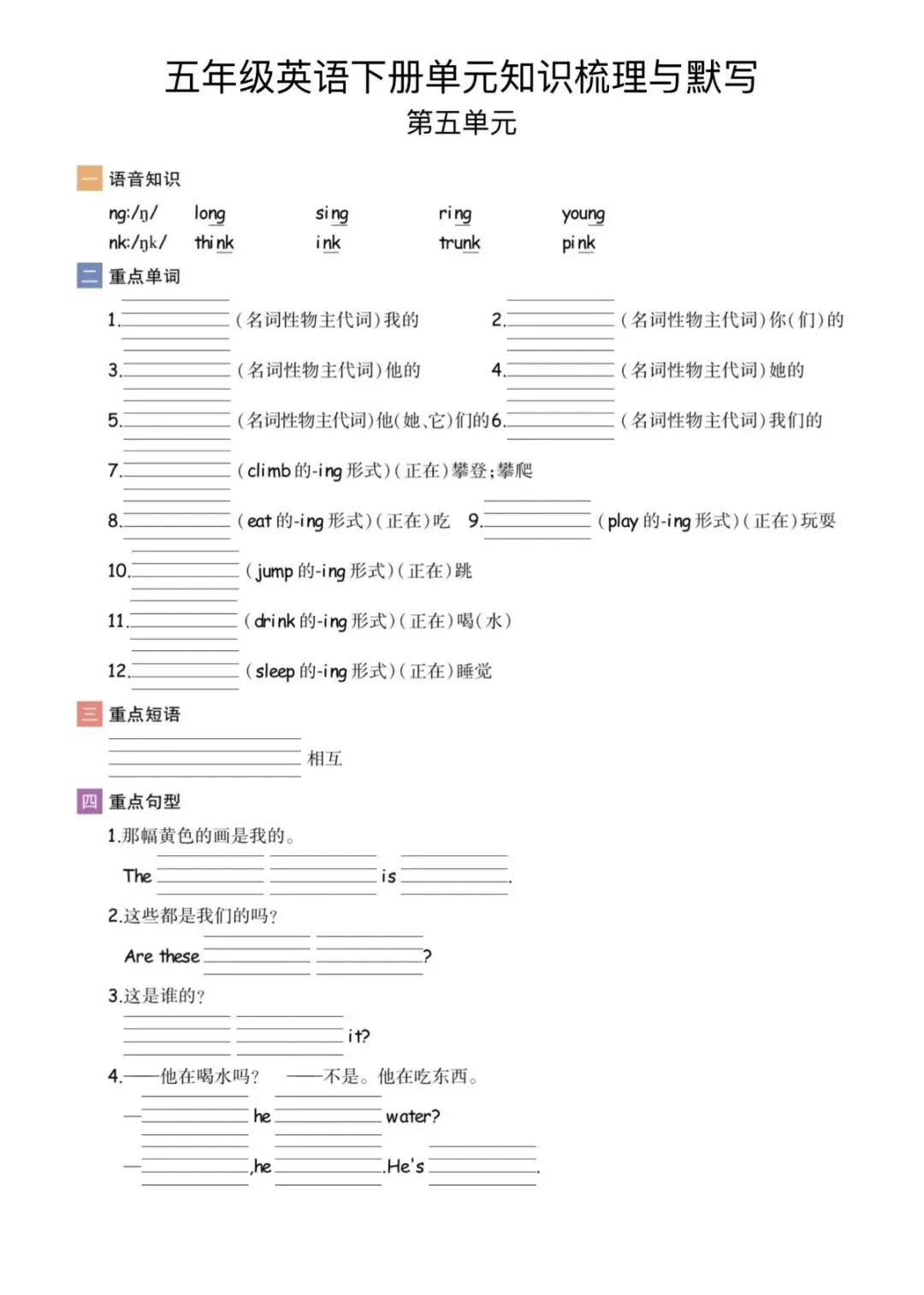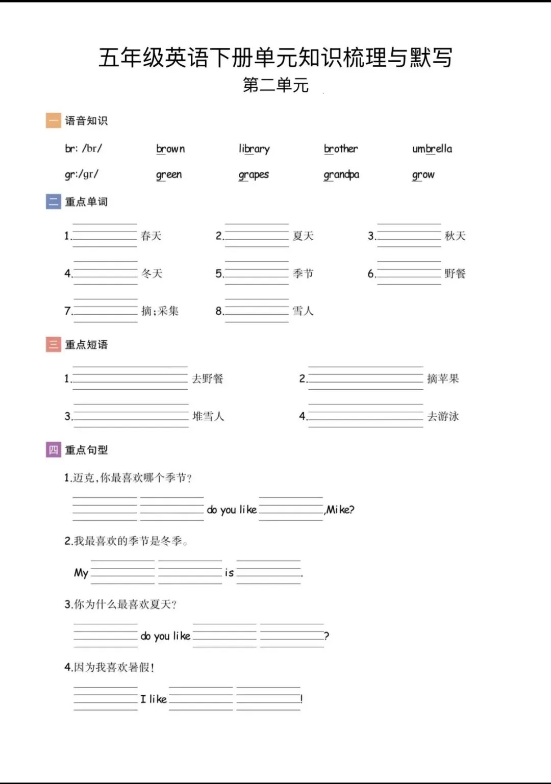 单词记不牢、句型易混淆?词句默写是夯实英语基础的关键!今天整理了五年级下册必背核心单词、重点句型默写内容,紧扣课本考点,每天默写一遍,轻松攻克记忆难点,基础越练越扎实!