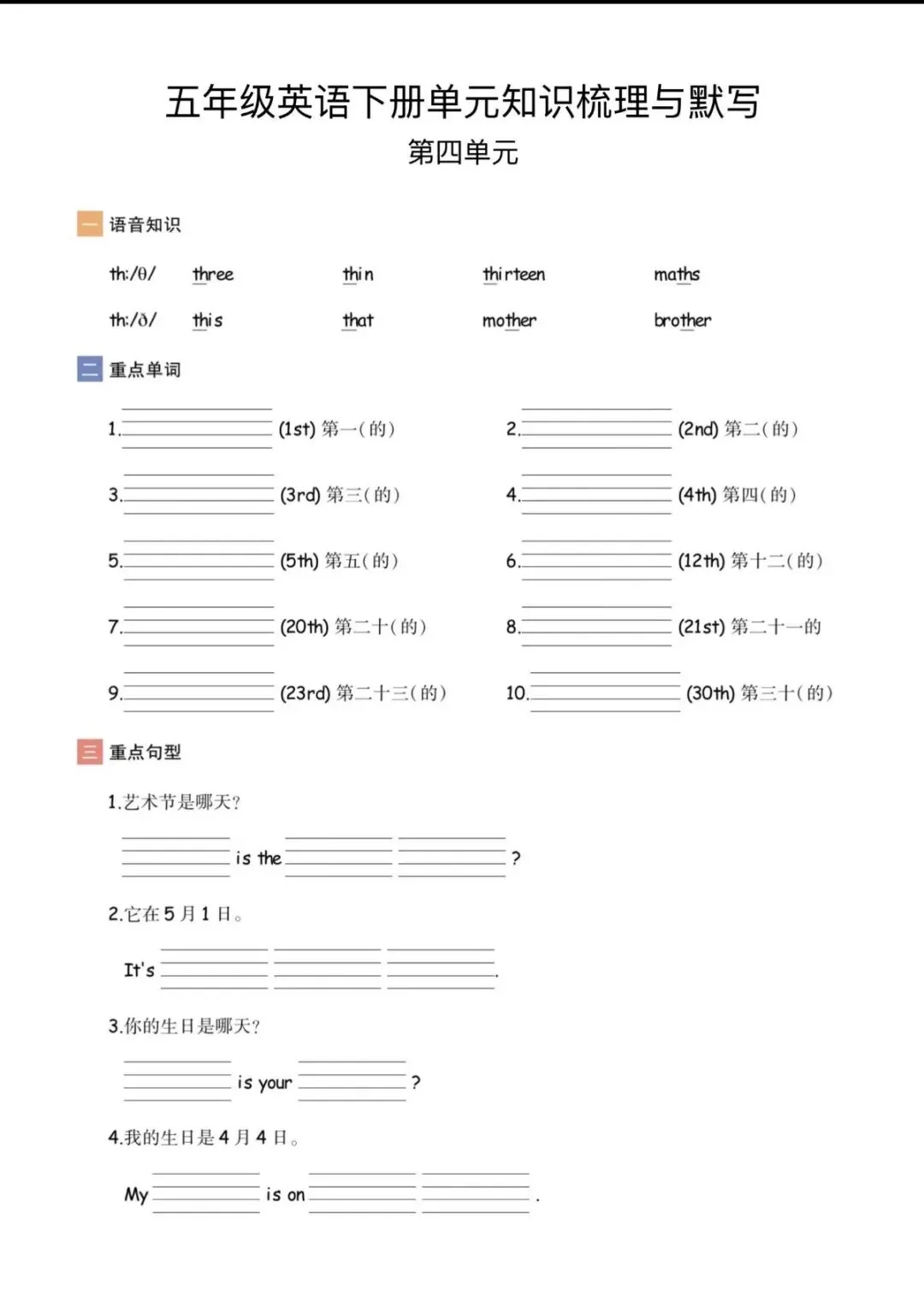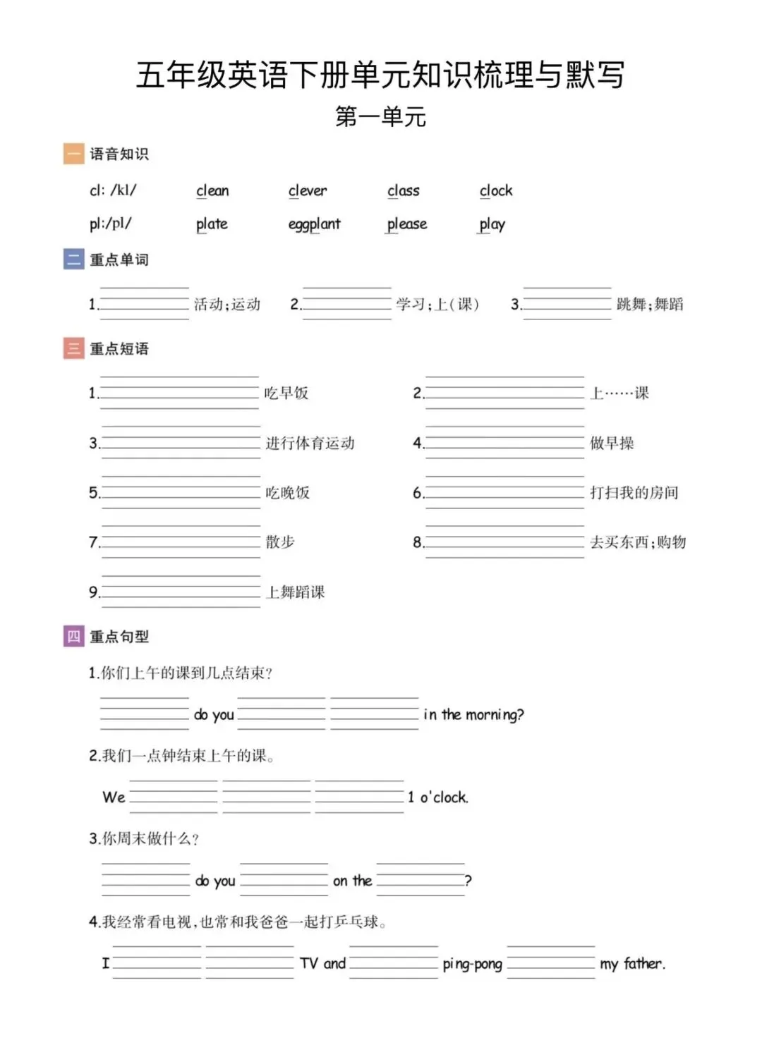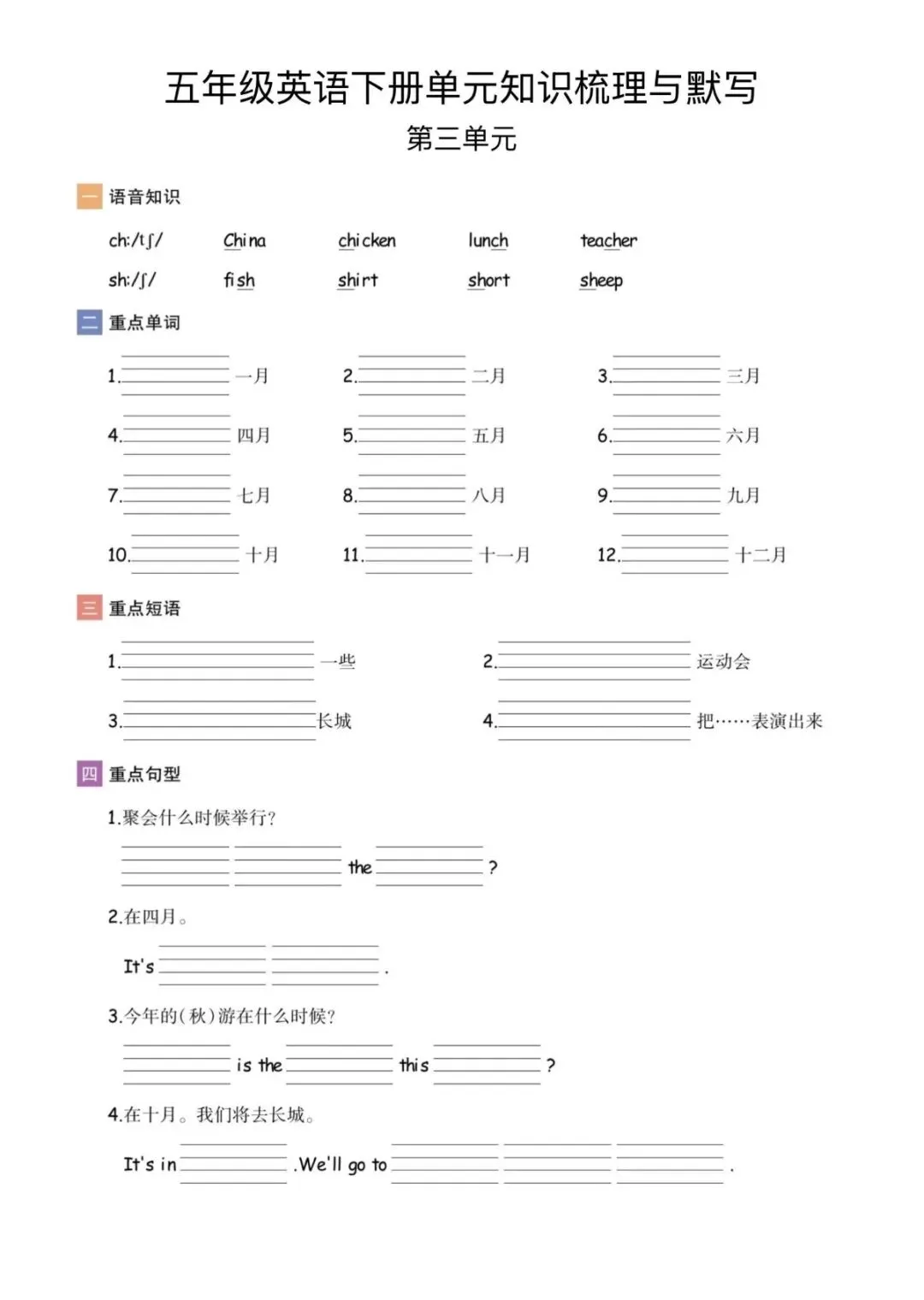 单词记不牢、句型易混淆?词句默写是夯实英语基础的关键!今天整理了五年级下册必背核心单词、重点句型默写内容,紧扣课本考点,每天默写一遍,轻松攻克记忆难点,基础越练越扎实!
