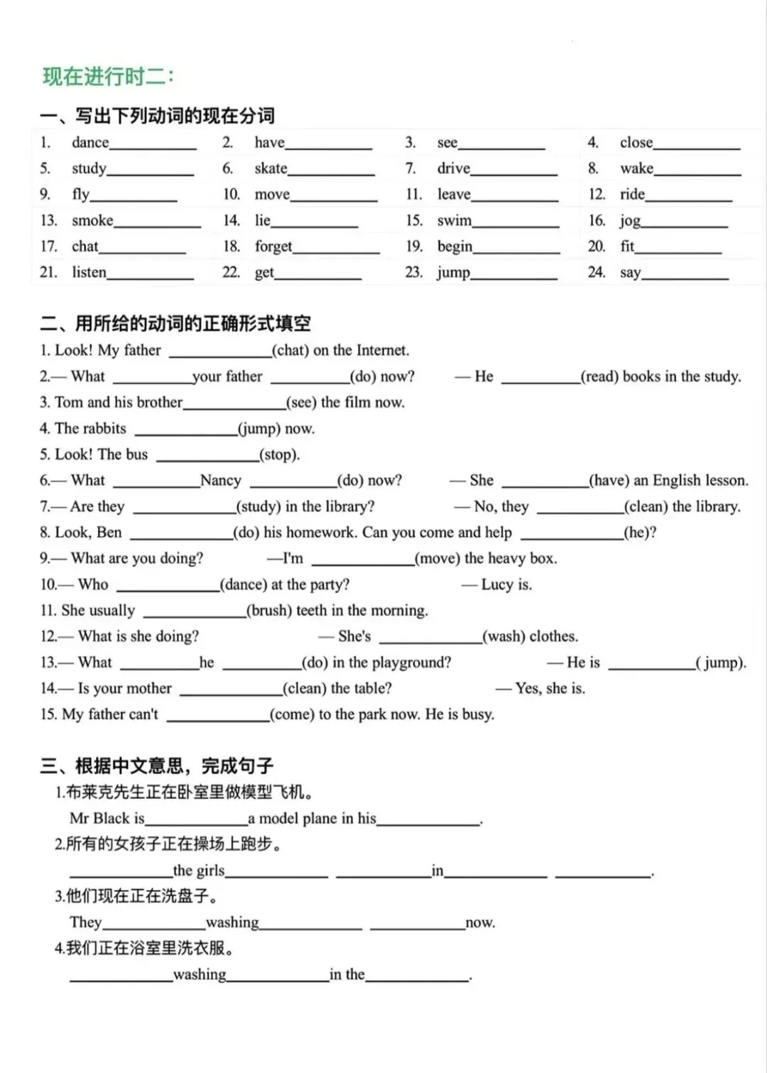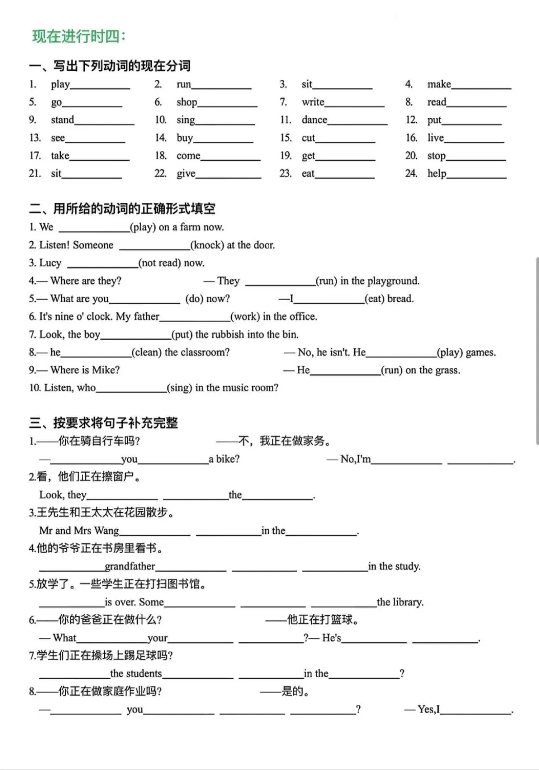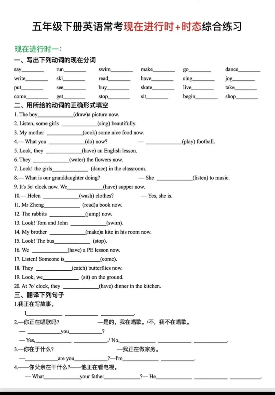 【习题】可打印| 五年级下册英语常考现在进行时+时态综合练习