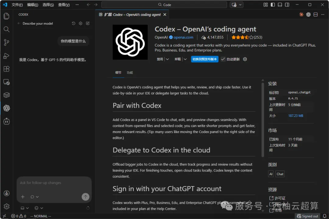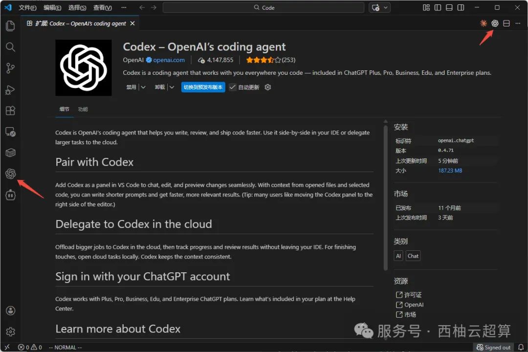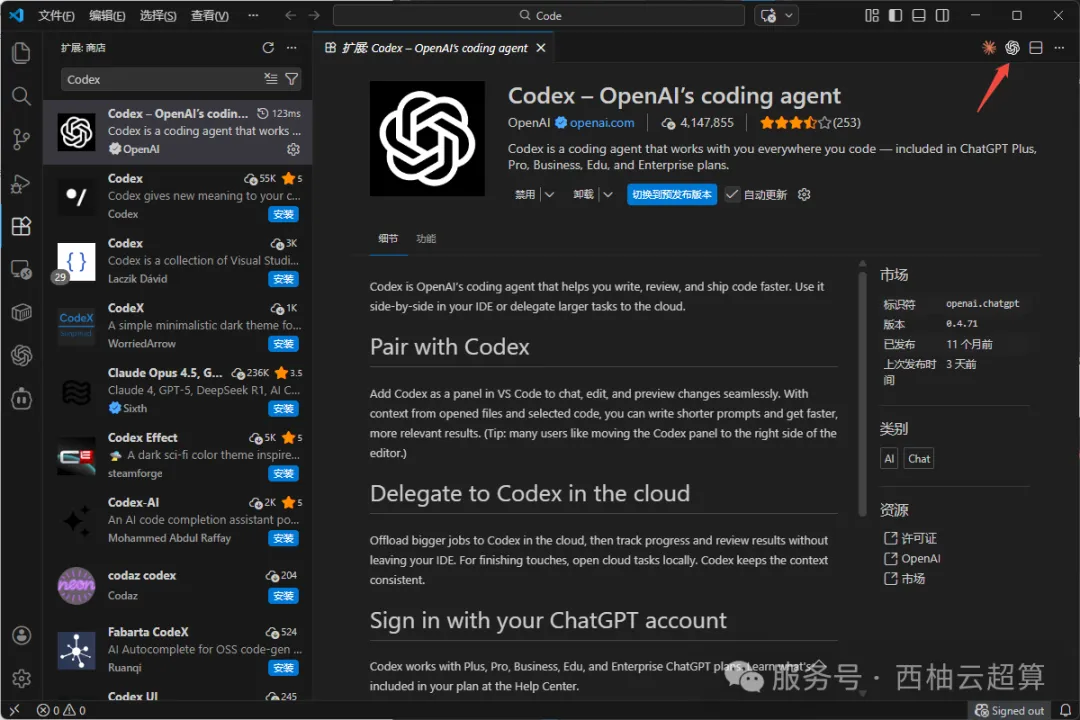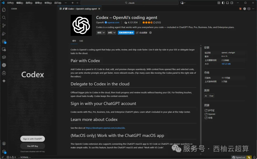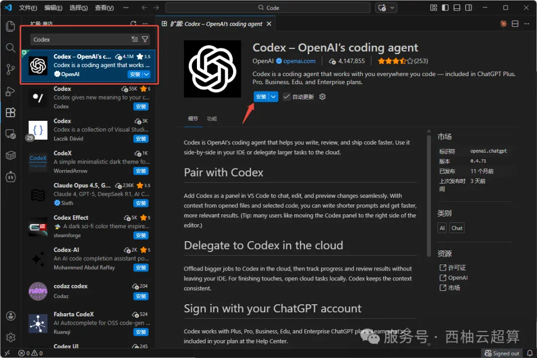 在VSCode左侧扩展图标搜索Codex并安装,认准openai。