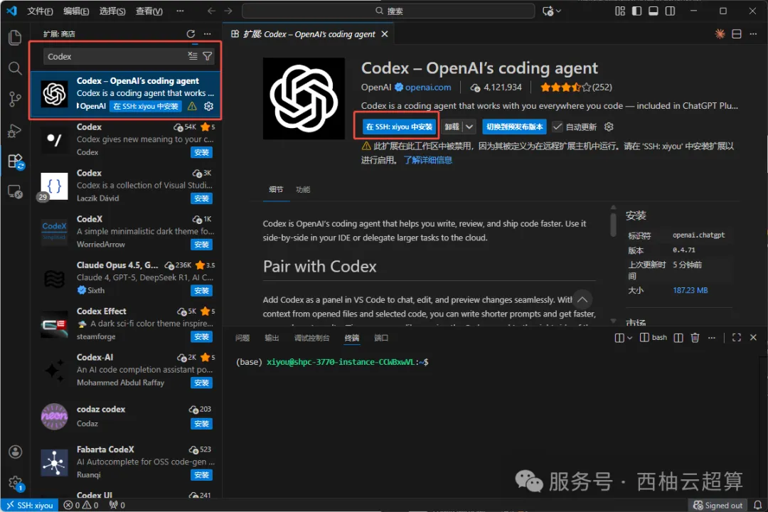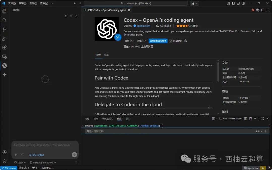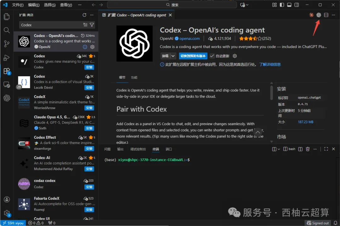 此安装是在远程主机上安装,安装完成之后会显示已在远程主机启用扩展,且右侧活动栏出现Codex图标