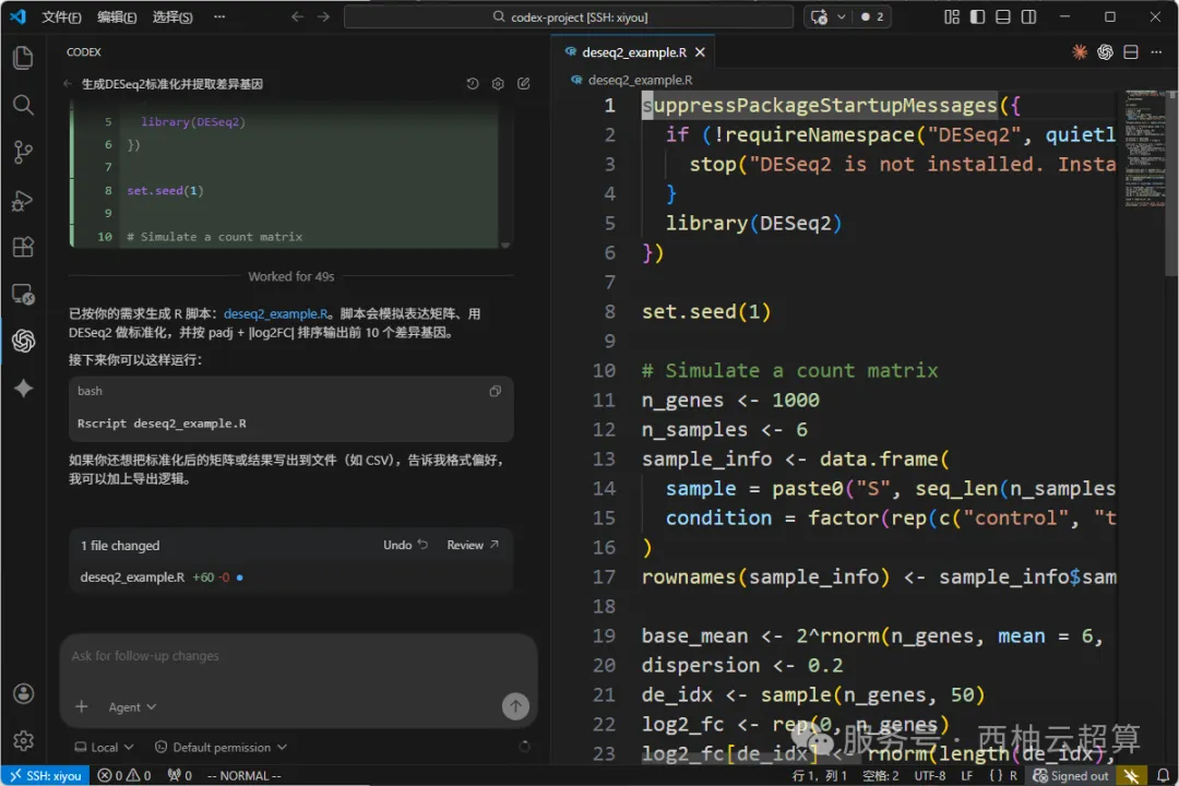 直接描述任务,例如:”请生成一个R脚本,使用DESeq2对一个假想的表达矩阵进行标准化,并输出前10个最差异表达的基因”