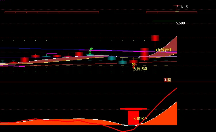 主图(结构与衰竭):通过特殊K线染色直观呈现买卖盘的极度衰竭区域,并自动生成动态的阻力与支撑位。当价格结构满足特定转折条件时,系统会弹出“反转拐点”或“★加速行情”确认信号。