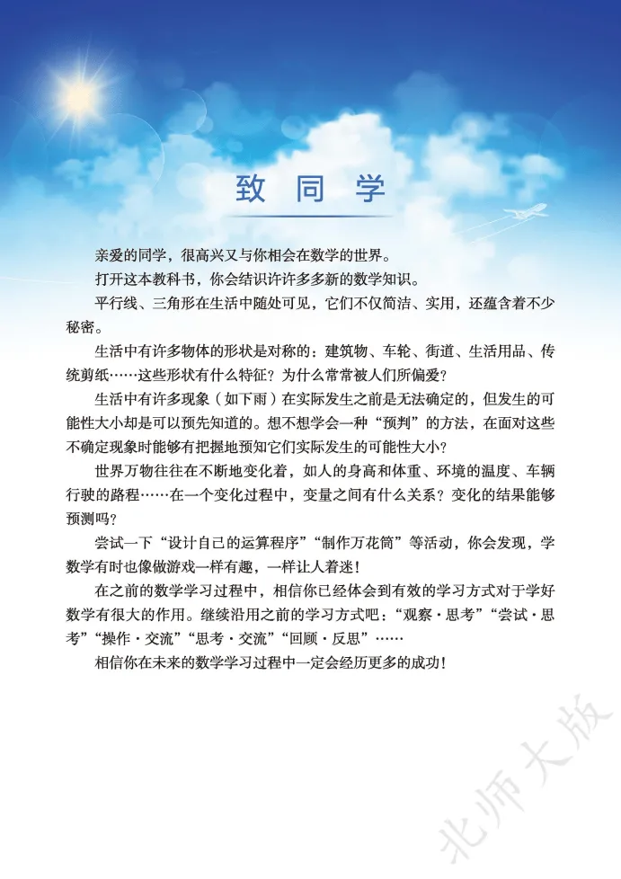 ,然后发送 电子课本 七年级数学入门重点!2026春北师大版七年级下册数学第三单元为《变量之间的关系》,是初中数学中函数知识的启蒙章节,衔接七年级上册基础,侧重培养学生的数据分析与逻辑思维,贴合全国多地教学进度,孩子预习复习直接对照,不用费心整理,为后续学习一次函数、二次函数筑牢基础。本单元核心知识点精准拆解,适配课堂考点,通俗易懂好掌握:核心是区分常量与变量,在一个变化过程中,数值始终不变的量叫做常量,数值发生变化的量叫做变量,其中主动变化的量是自变量,随着自变量变化而变化的量是因变量,比如路程、速度、时间的关系中,速度不变时是常量,时间是自变量,路程是因变量。重点掌握变量之间关系的三种表示方法,表格法一目了然,能快速找出自变量与因变量的对应值,但只能反映部分数据;关系式法简单明了,能准确反映整个变化过程的关系,关键是将因变量单独写在等号左边,自变量的取值要符合实际意义;图象法形象直观,横轴表示自变量,纵轴表示因变量,能清晰看出因变量的变化趋势,比如图象上升表示因变量随自变量增大而增大,平行于横轴则表示因变量保持不变。此外,还要掌握从表格、关系式、图象中提取信息的方法,解决注水、爬山、汽车行驶等实际场景问题,规避混淆自变量与因变量、误读图象含义、忽略自变量实际取值范围等易错点。