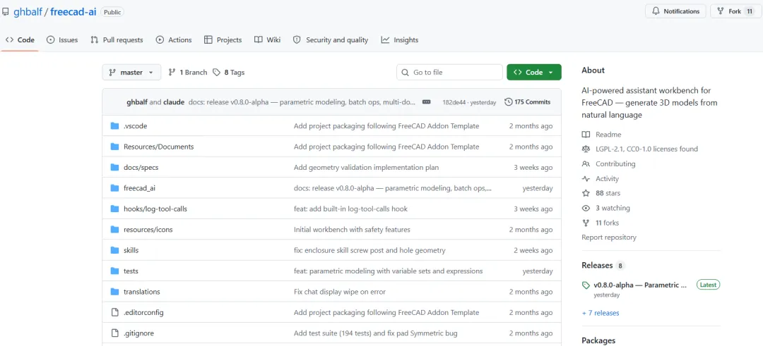 言归正传,写这篇文章的灵感来源于GitHub开源项目freecad-ai,也关注了很多的同类型项目,效果一般,但是重点在于提升效率,我感觉有明确GUI的工业软件可以使用AI进行辅助设计,因为它本身的逻辑就很强了,没有熟练的操作也可以通过AI完成自己的任务,而纯代码驱动的CAD工具,就可以交给AI。freecad-ai这款只有几千行代码的插件,为FreeCAD赋予了AI辅助设计能力:用户只需输入自然语言描述,就能自动生成三维模型、优化设计方案、生成工程图纸。