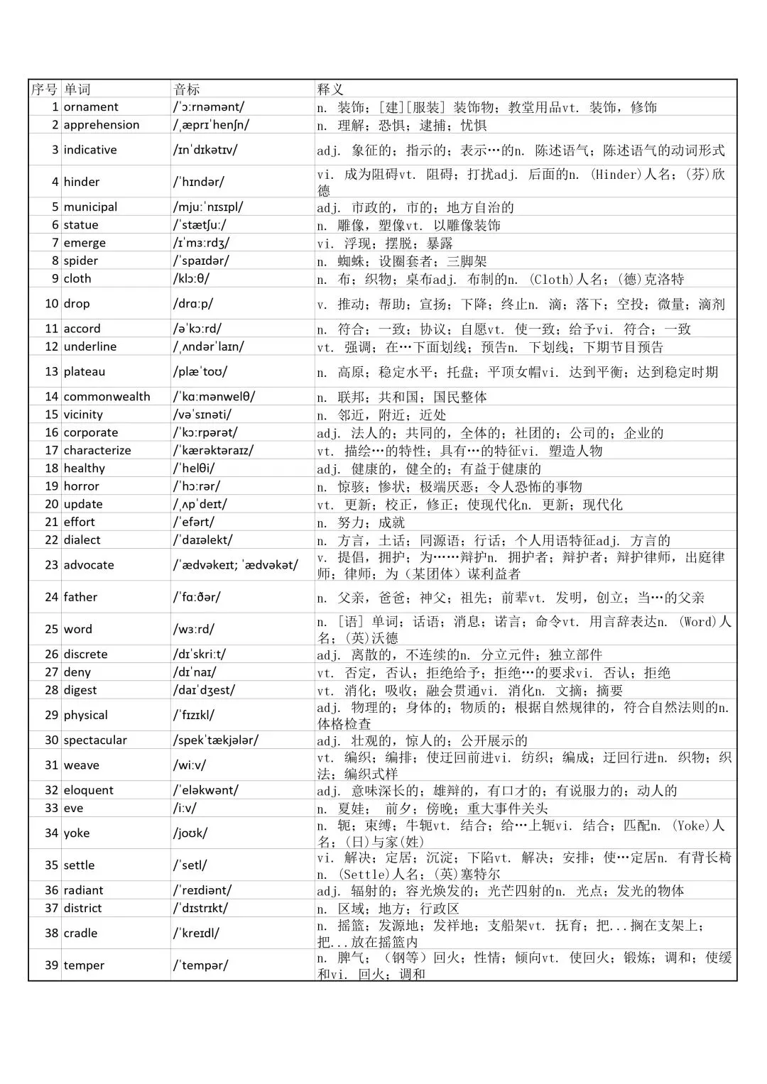 11、substantial /səbˈstænʃl/ adj. 大量的12、inevitable /ɪnˈevɪtəbl/ adj. 不可避免的13、complex /ˈkɒmpleks/ adj. 复杂的14、controversial /ˌkɒntrəˈvɜːʃl/ adj. 有争议的15、sustainable /səˈsteɪnəbl/ adj. 可持续的16、innovation /ˌɪnəˈveɪʃn/ n. 创新17、trend /trend/ n. 趋势18、consequence /ˈkɒnsɪkwəns/ n. 后果19、perspective /pəˈspektɪv/ n. 视角20、motivation /ˌməʊtɪˈveɪʃn/ n. 动机