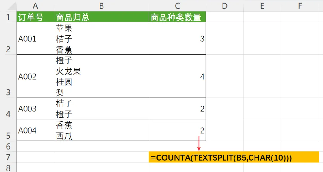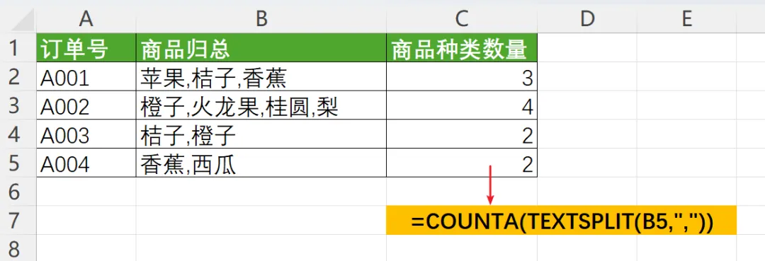 TEXTSPLIT还可以和其他函数组合使用。比如,要计算商品种类数量,可以和COUTA函数结合。