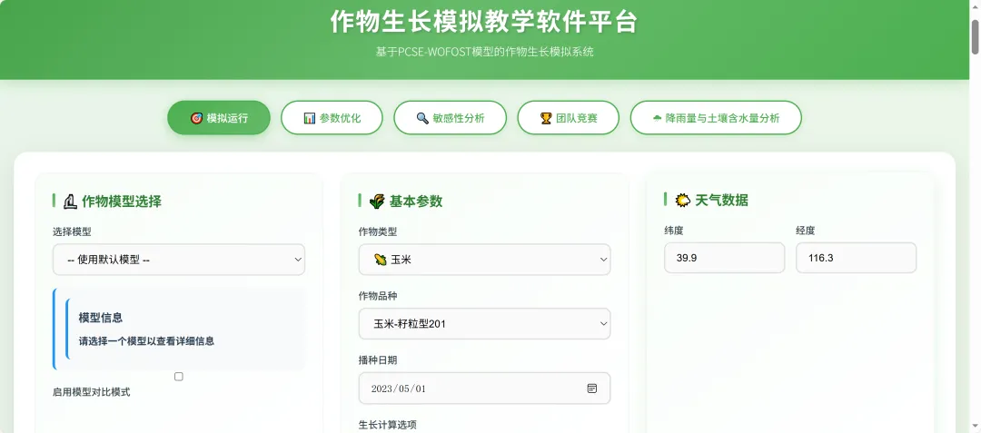本作物生长模拟教学软件平台是基于PCSE-WOFOST核心模型开发的专业化教学与实践工具,旨在为农业相关专业学习者、教学者及科研入门人员提供直观的作物生长模拟体验。软件以玉米等作物为主要模拟对象,整合了作物生理生长模型、气象数据接口、土壤水分管理等核心功能,可实现作物生长过程的动态模拟、参数优化、敏感性分析等多元化应用,同时支持团队竞赛模式,助力提升教学互动性与实践操作性。