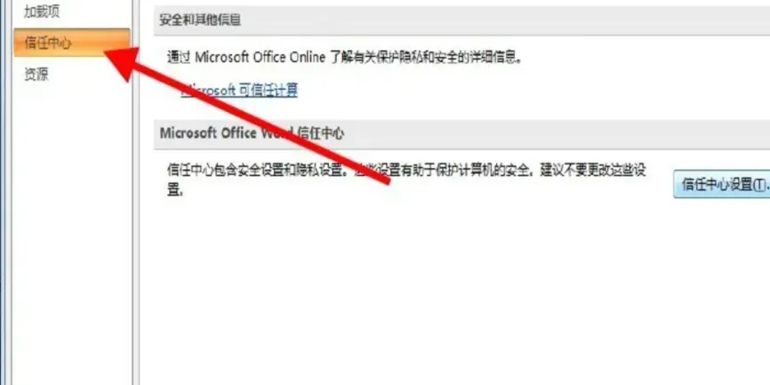 (2)选择选项 → 找到信任中心