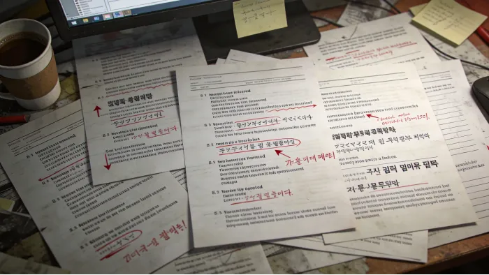 电脑屏幕显示混乱的多语言文档:英文、中文、日文、韩文混杂排列,段落错乱,格式不统一,字体大小不一,有红色批注和箭头,背景是杂乱的桌面,整体难以阅读和理解。