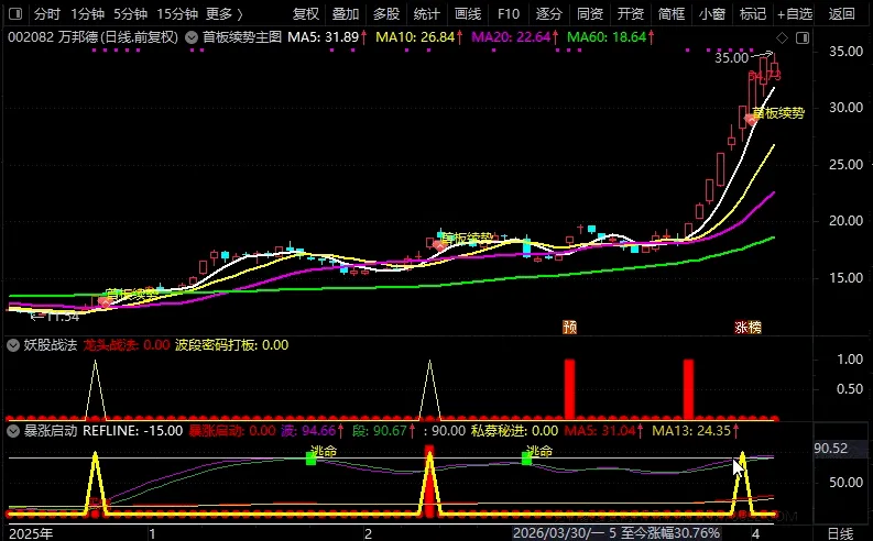 1. 信号共振:两个副图,【暴涨启动副图】出现黄色「私募秘进」+红色柱体、【妖股战法副图】出现红色柱体+黄色「波段密码打板」信号,为最佳妖股启动打板点;