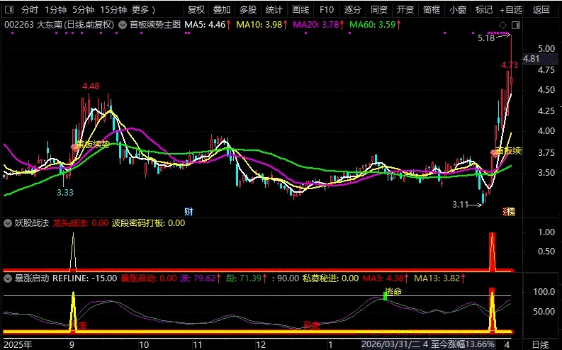 2. 买卖参考:【暴涨启动副图】「买底」信号为低位潜伏点,「逃命」信号为高位止盈点;【妖股战法副图】红色柱体为强势打板确认信号;