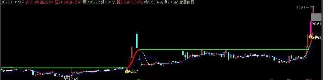 这个指标主要用于识别股票的强势启动信号。它通过计算短期均线和长期趋势线的关系,结合特定K线形态来捕捉买入时机。当短期均线突破长期趋势线,同时出现放量上涨且实体较长的阳线时,系统会标记”启动”信号。操作策略是在出现启动信号时考虑买入,持股线走平时注意风险控制。