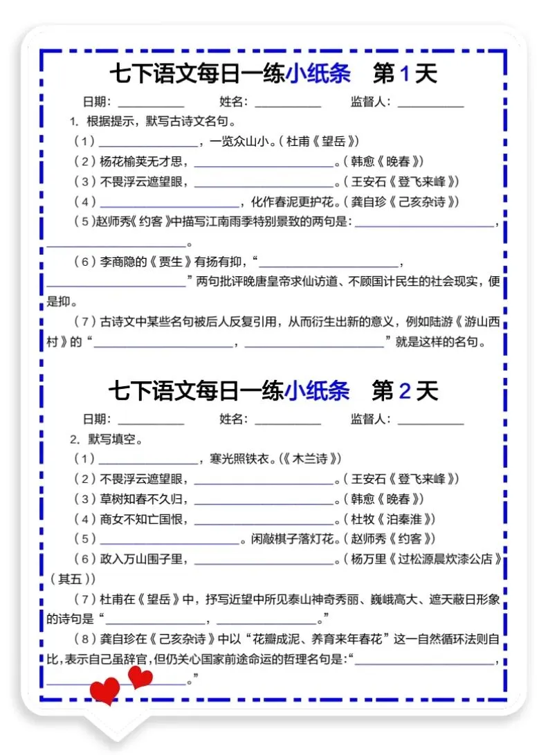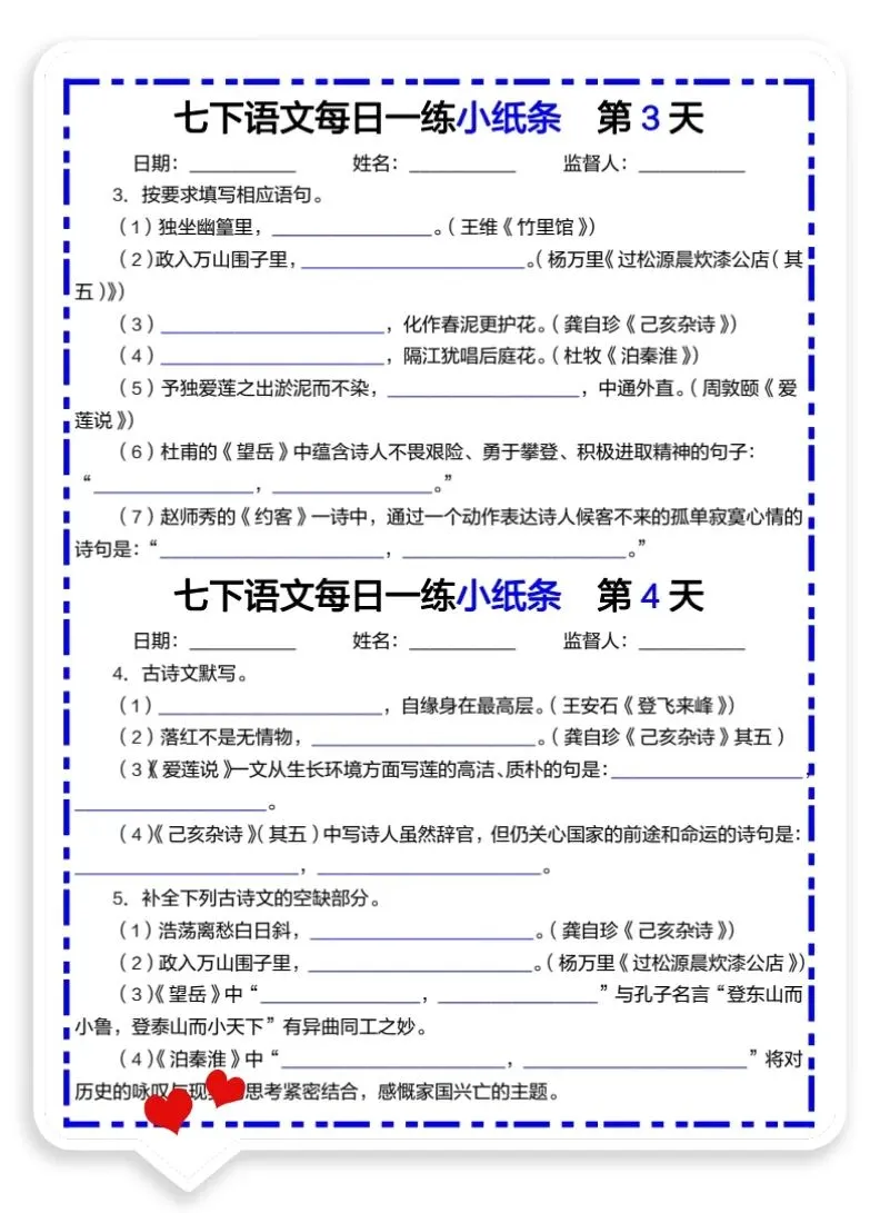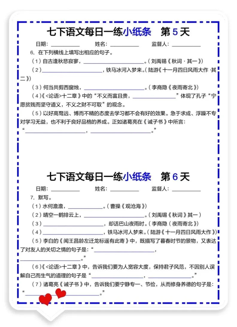 今日分享:七年级下册语文《每日一练小纸条》 电子版可打印,七年级下册语文古诗文默写是期中、期末必考题型!每天花5分钟,用小纸条打卡练习,轻松夯实基础,期末拿高分!拉至文末可直接领取完整电子版